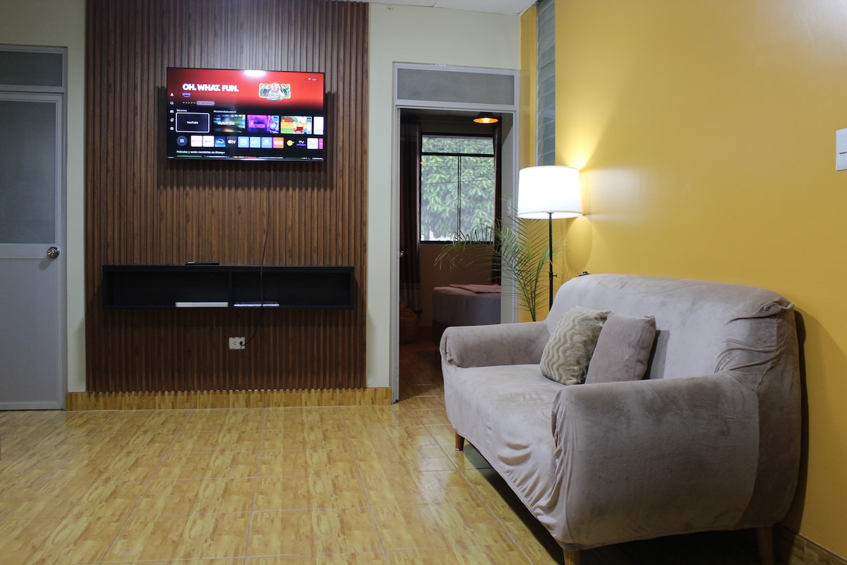 Enjoy the comfort and natural jungle charm of this cozy apartment in a quiet area with plenty of natural light. Perfect for families, couples, or remote workers. It has 2 bedrooms: one full-size bed and two single beds, a living room, a workspace with fast Wi-Fi, a dining area, a kitchen, a bathroom, a laundry area, and on-site parking inside the building. Ideal for those looking to escape the routine. Tingo María, Peru.