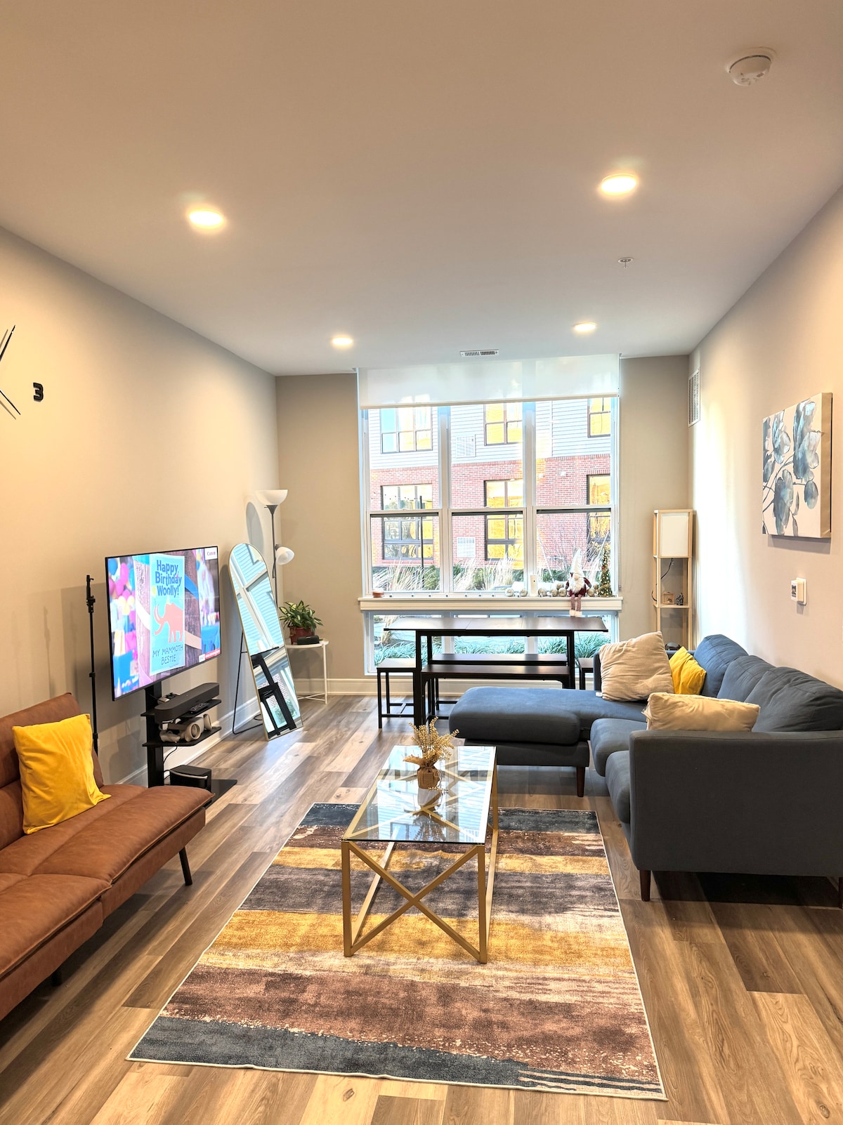 ✨ BRAND NEW 2025 FURNITURE & FIXTURES! ✨ Unwind in this modern retreat just minutes from NYC, where style and comfort meet. Located in the heart of downtown, you’ll be steps from parks, cafés, shops, and easy transit to NYC. Inside, enjoy elegant bedrooms, dedicated office space, and the convenience of an in-building washer/dryer — everything you need for a comfortable stay.
