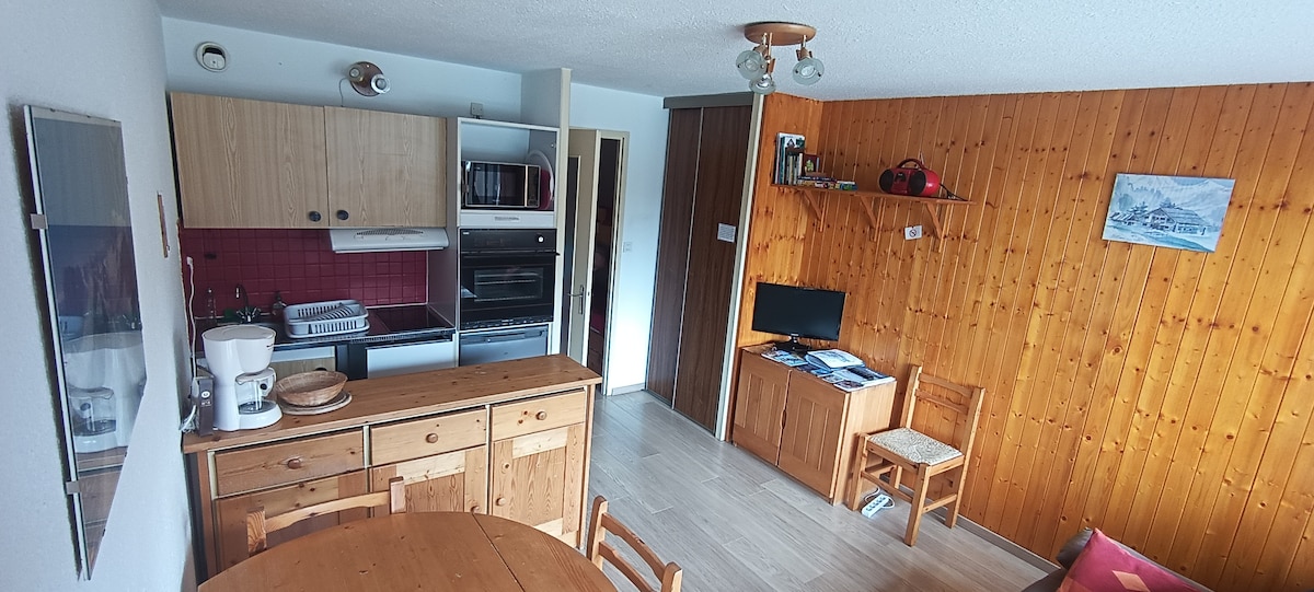 Studio lumineux à l'ambiance montagnarde, exposé sud ouest avec balcon, situé face à la remontée mécanique Alpe Express et commerces (skipass, esf, location matériel, supérette, restaurants, bar, laverie). Pièce à vivre composée d'une cuisine équipée: lave vaisselle, four à micro ondes, cafetière Senseo, grille pain. Canapé-lit (130x190 cm) et 2 lits superposés (80x190 cm) escamotables. Salle de douche et WC séparés, cellier pour rangement. Casier à ski privatif. Draps en supplément sur demande