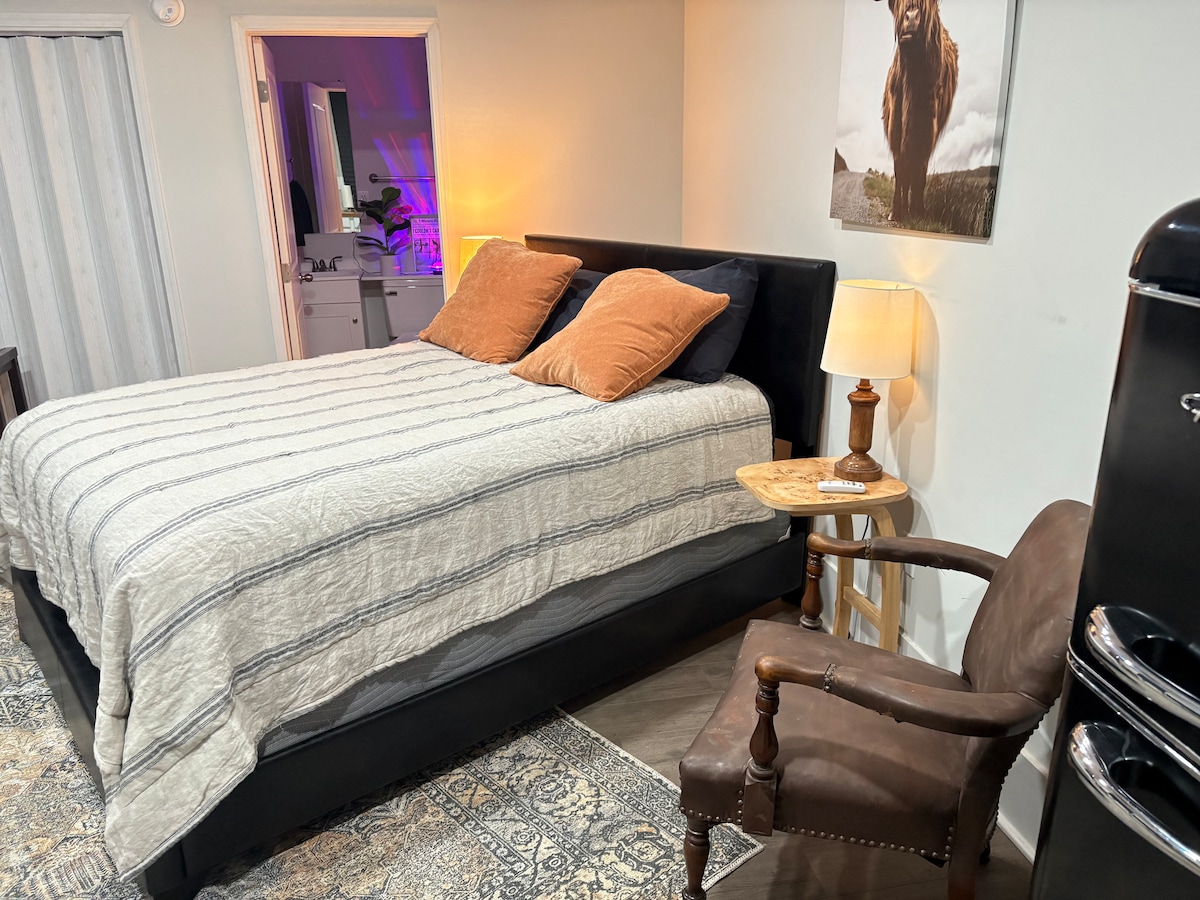 Welcome to Frog Stomp. It's a private guest house nestled in the woods. We affectionately call it Frog Stomp because our neighbors have a pond and during the summer there are hundreds of baby tadpoles that are make their way around the guesthouse. So if you are scared of little tiny frogs, this is not the place for you.🐸Frog Stomp is 1BR 1BA. It has a kitchen with fridge, stove, and kurieg coffee maker. The bathroom has a shower. The bedroom has a Queen sized Sealy memory foam and a toddler bed