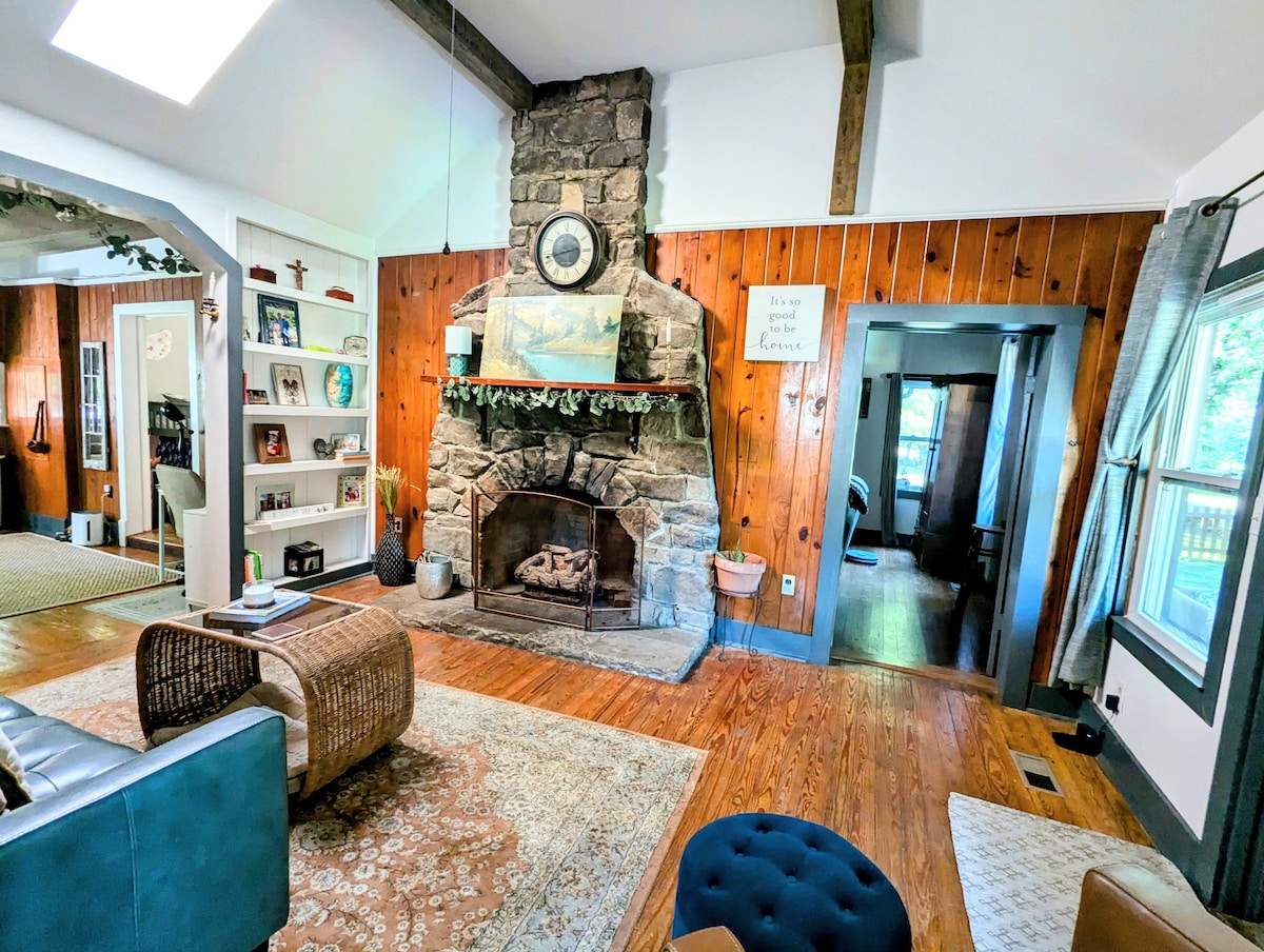Our second home is a mix of mid-century modern and "cabin in the woods." It sits on 2 heavily wooded acres and backs up to a mountainside with rock outcroppings. The main living area (living room, dining area, and kitchen) is raised about 4 steps, and the bedroom and bath areas are on the main level. There is one large bathroom with a shower. There is an electric fireplace surrounded by ledge stone in front of the u-shaped built-in sofa. There is abundant reading material & 2 TV's.
