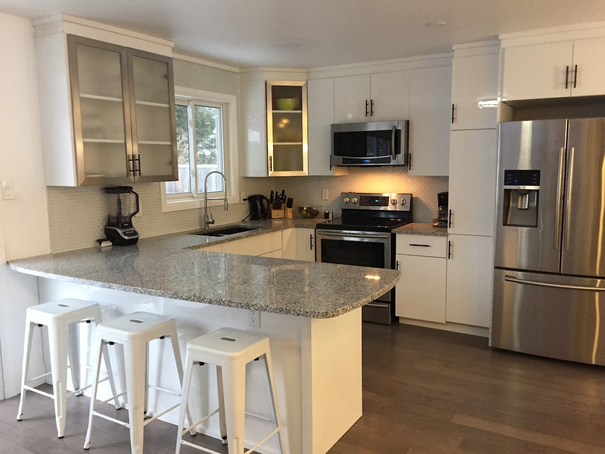 A tranquil, beautiful & cozy 4-bedroom home for families and friends getting together. Walking distance to lake, groceries, LCBO, pharmacy, pub and restaurant. Close to numerous resorts and parks for summer and winter fun. Spacious kitchen and backyard deck are fully equipped with all your needs. Guests will enjoy all the entertainments both inside and outside all year round.. Daily rate is for 8 guests or less. No parties nor smoking allowed.