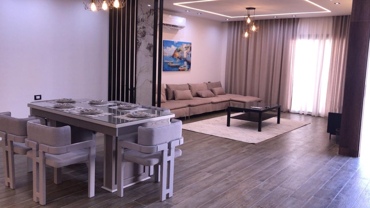 new wonderful ,quiet and fully equipped big appartment , in The View Resort, Hurghada. The right place for spend a quiet and comfortable holiday where you can wake up to the view of the beautiful sea and the wonderful swimming pool and enjoy spending a wonderful time in the private gardens in the compound. The apartment is very nice and suitable for big families or four guests Guests have access to the swimming pool and the beach. I am really sure that you will spend the best vacation ever.