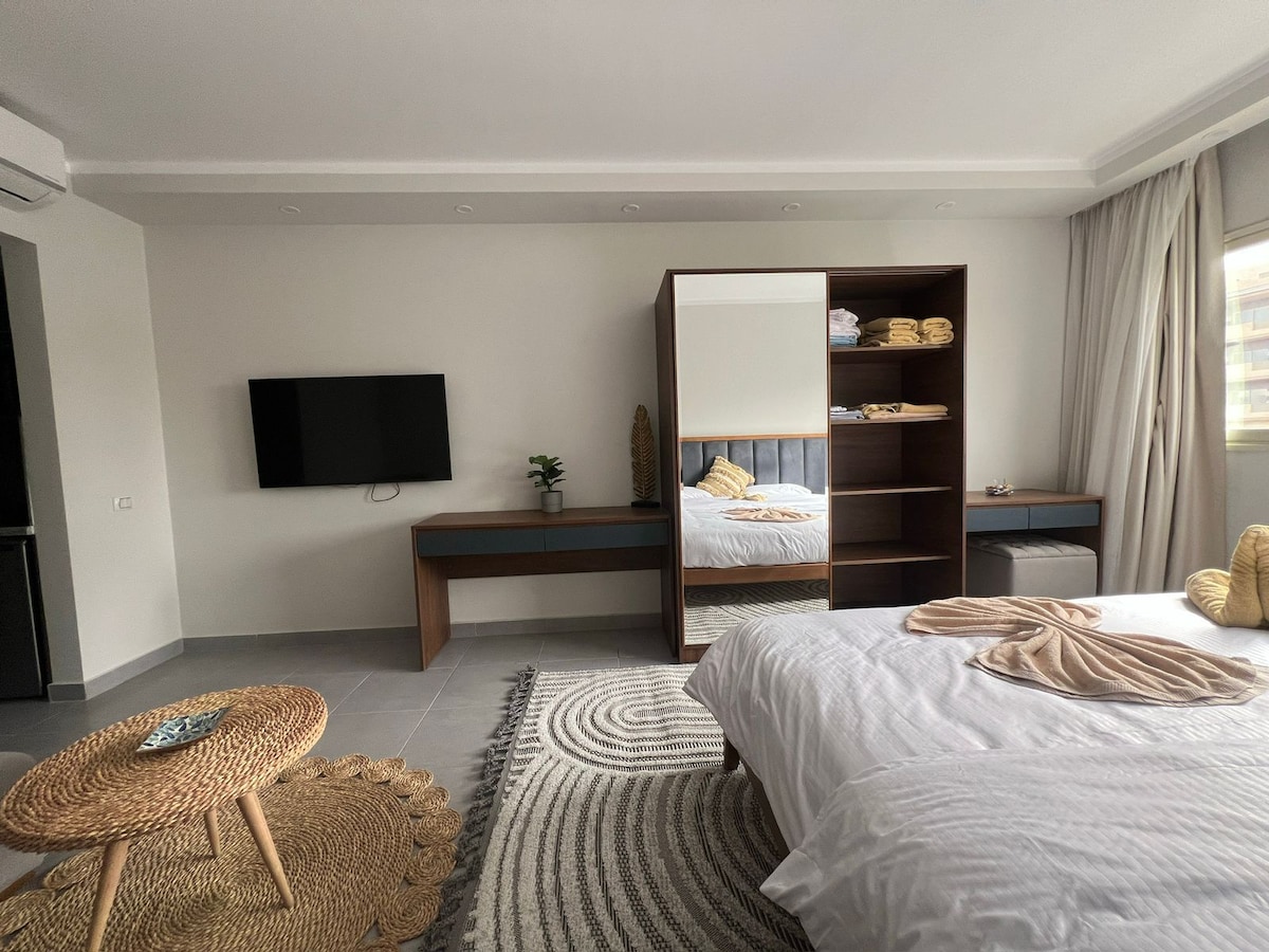 Relax in our cozy sea-view studio in central Hurghada, right by the Red Sea. Perfect for couples, solo travelers, or small families looking for comfort, great location, and resort vibes near the city center. What You'll Like: Free private beach and swimming pool access Red Sea and pool views from your private balcony Prime location on Old Sheraton Street – close to cafes, shops, nightlife & supermarkets Free Wi-Fi, 24/7 security & on-site parking Complimentary shuttle bus within the resort