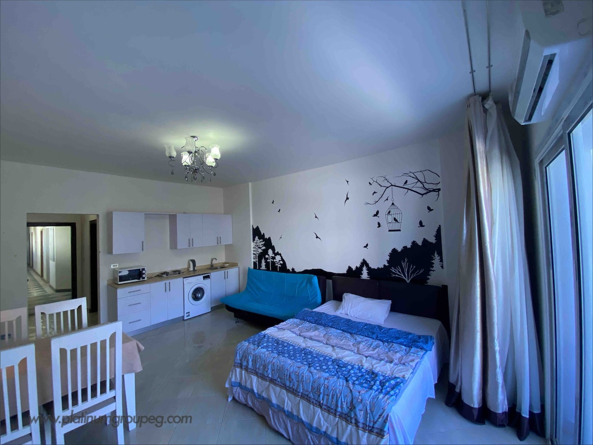 Brand new studio with cozy interior modern furniture , huge balcony and private sandy beach, available 3 pools, sport court . The resort is 10 minutes from Hurghada city center and 10 minutes from Hurghada marina, the airport is 15 minutes far away. Golden beaches and guaranteed sunshine are what made Hurghada famous to spend your holiday. The colourful reefs, amazing corals and tropical fish are among the finest in the world. Your perfect holiday by the sea and sunny weather all year