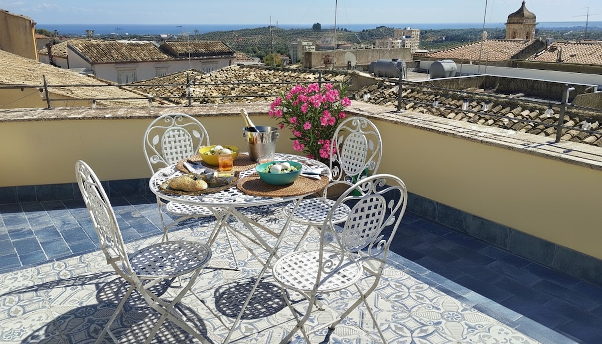 The apartment 'A Mecca, located in a historic house renovated in complete harmony with the original structure, a stone’s throw from the main street and the Cathedral of San Giorgio, will allow you to immerse in the heart of the city, explore the center on foot and appreciate the local culinary and artisanal traditions. The large terrace with magnificent view of Cartellone district will reveal you the beauty of Modica lit up with the evening lights, giving you the atmosphere of a timeless Sicily.