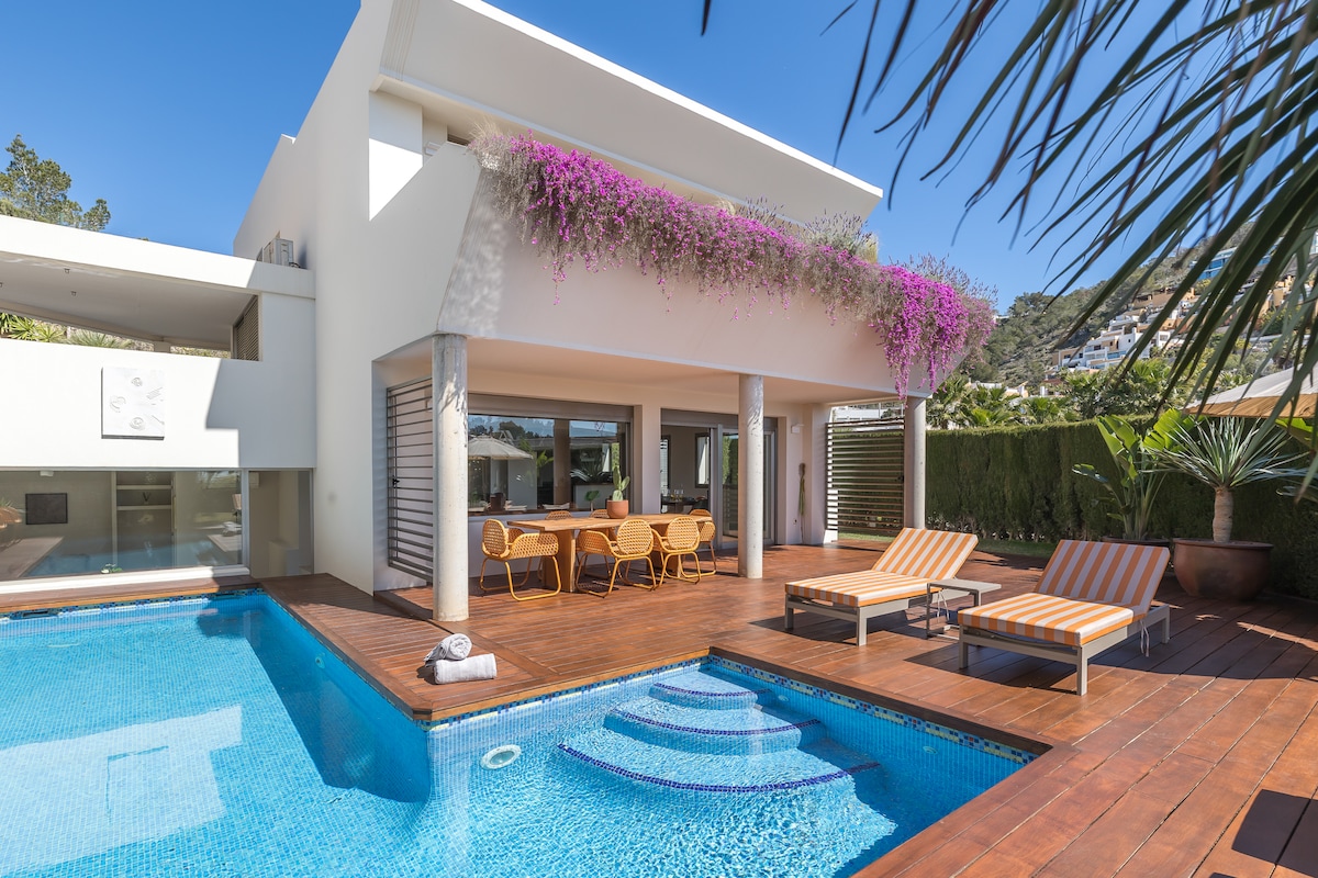 Can Rin, exclusiva villa con jardín y piscina privados, vistas al mar y a la bahía de San Antonio. Idealmente situada en un residencial muy tranquilo y selecto, donde disfrutar del sol y la naturaleza. La casa es amplia, cómoda y elegante, de estilo mediterráneo y todo en ella es de calidad. Muy bien comunicada a Ibiza por autovía, muy cerca de Sant Josep y las mejores playas, próxima a todos los servicios habituales.