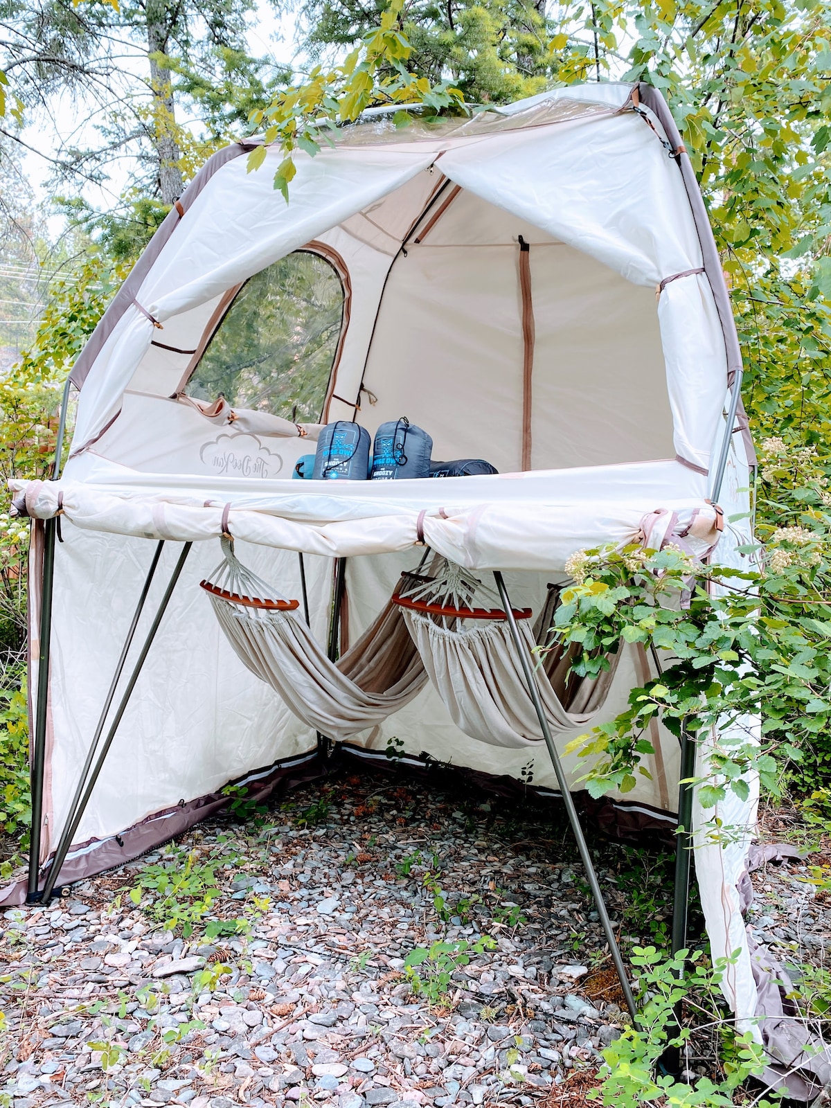 One of the first double decker tents to hit American soil! This amazing lofted space was a Kickstart project out of South Korea and we knew it would be a great experience for our guests! Everyone loves a good hammock. But, have you slept in an elevated tent? Simple, rare, cushy and cozy. Not for the faint of heart. You must be the outdoorsy type. If that's you, prepare yourself for an experience. Fresh sleeping bags can be added for $10 (with advance notice). Porta John on site. No shower.