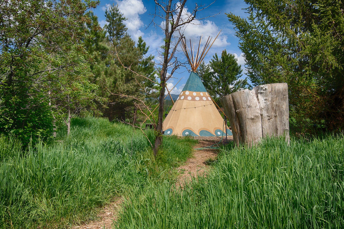 Experience glamping with a unique Native American-style tipi at North Haven Campground in Bonners Ferry, Idaho! This spacious tipi features a comfortable queen-size bed and a futon sofa sleeper. Enjoy the convenience of a mini-fridge, microwave, and coffee maker, plus a portable AC and heater to keep you cozy in any season. Outside, relax in the provided chairs or gather around the fire pit under the stars. A nearby bathhouse with toilets and showers is just a short walk away.