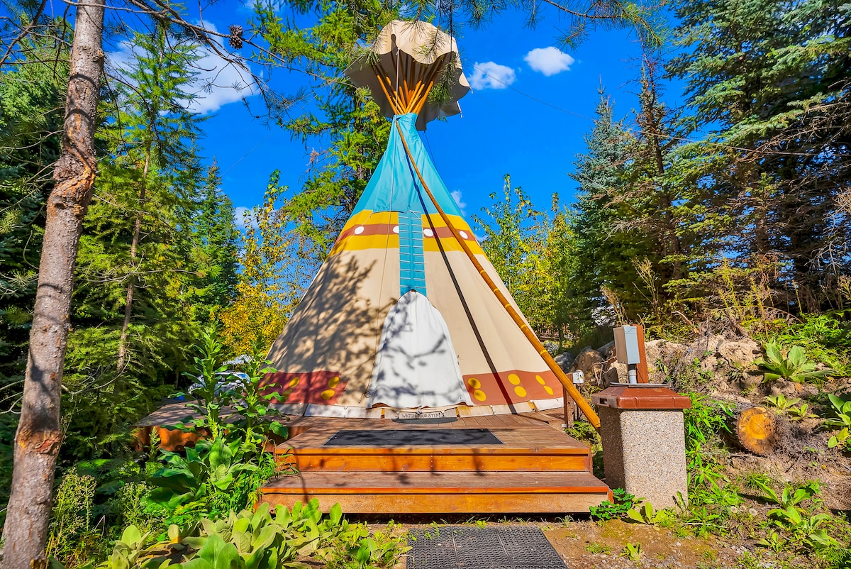 Experience glamping with a unique Native American-style tipi at North Haven Campground in Bonners Ferry, Idaho! This spacious tipi features a comfortable queen-size bed and a futon sofa sleeper. Enjoy the convenience of a mini-fridge, microwave, and coffee maker, plus a portable AC and heater to keep you cozy in any season. Outside, relax in the provided chairs or gather around the fire pit under the stars. A nearby bathhouse with toilets and showers is just a short walk away.