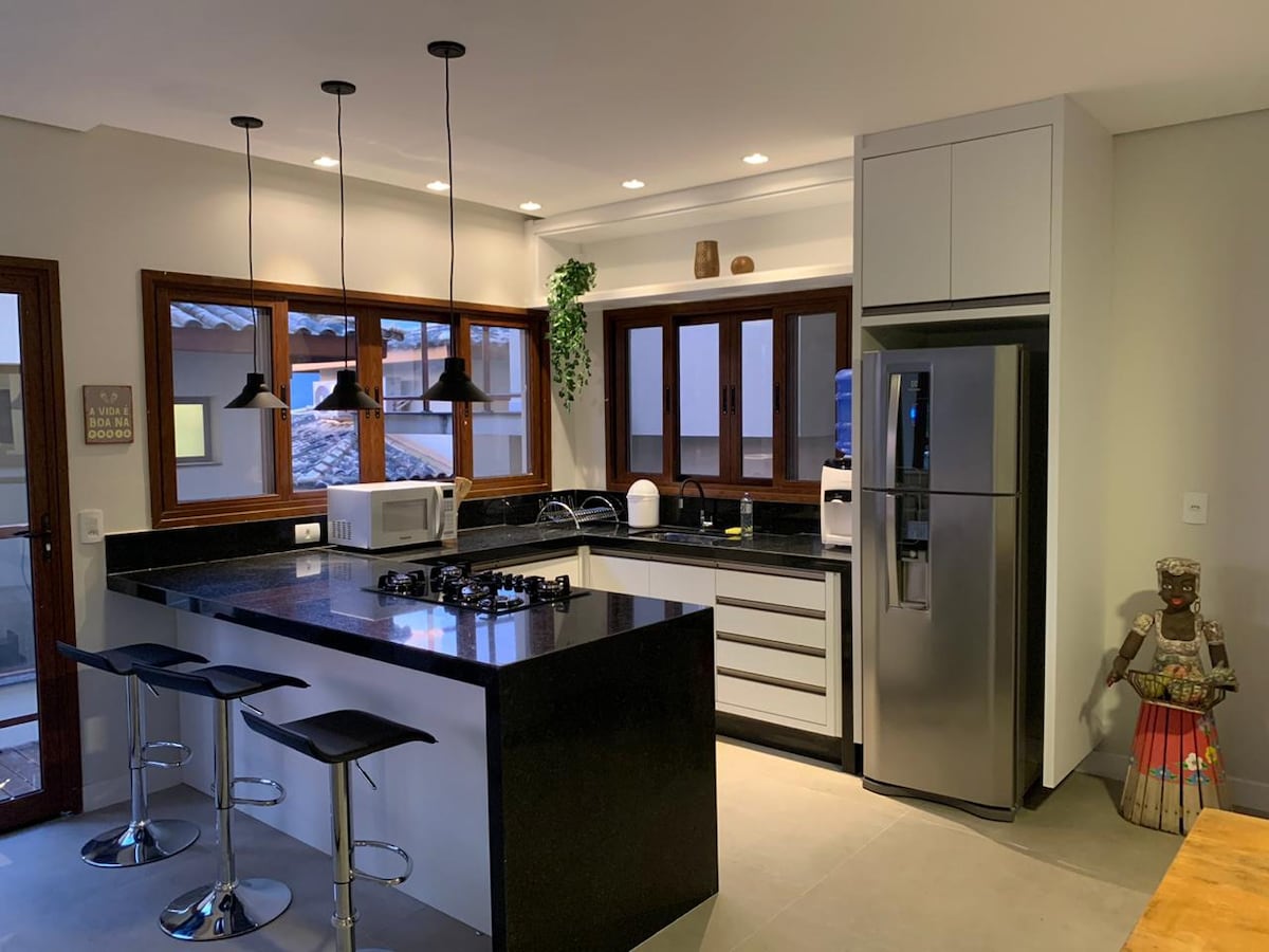 Nossa casa é nova, iluminada, ventilada e aconchegante, à 50 m da Praia Grande, uma das melhores praias da Ilhabela! São três quartos climatizados, com roupas de cama e banho, sendo duas suítes. A cozinha é completa, com microondas, eletrodomésticos e todos os utensílios. A sala tem uma smart tv com Sky HD. Temos Wi-Fi, estacionamento, máquina de lavar, varanda, churrasqueira, ducha e vista pro mar. Há bons restaurantes, pizzaria, bares, mercado, adega, padaria e farmácia nas proximidades.