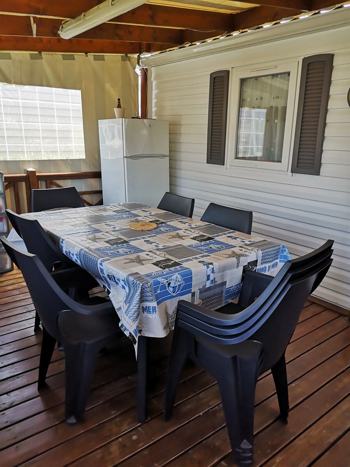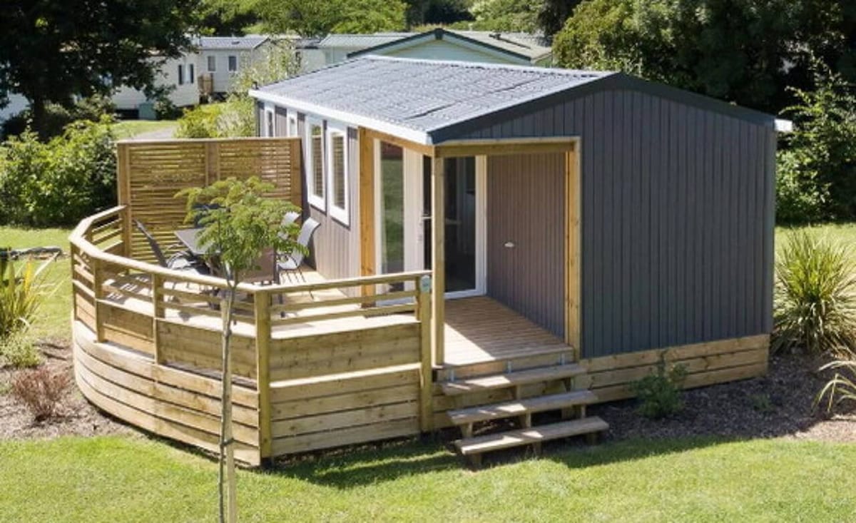 Mobil home de charme dans un domaine privé du bois d'amour a DINARD avec piscine 3 chambres séparées 1 salle bain 1 cuisine équipée avec 1 grand frigo 1 plaque gaz 1 four 1 micro onde 1 salon séjour 1 wc 1 grande terrasse avec cuisine extérieur 1 espace pelouse 1 cour privée pergola avec rideau et éclairage