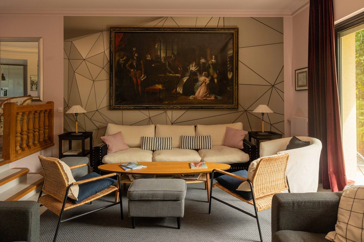 Ce gîte de standing de 240 m2 est aménagé au rez de chaussée d'une très grande villa construite en 1976, ancienne propriété d'un riche industriel des « trente glorieuses ». Rénové en conservant l'identité hédoniste du lieu, l'espace est articulé autour d'une salle de 140 m2 ou vous pourrez nager, déjeuner, vous relaxer ou écouter de la musique, et d’un grand salon de 40 m2 avec billard, tv de 2 m de diagonale, canal+... casque virtuel, vidéothèque, bibliothèque. Tennis accessible à tout moment.