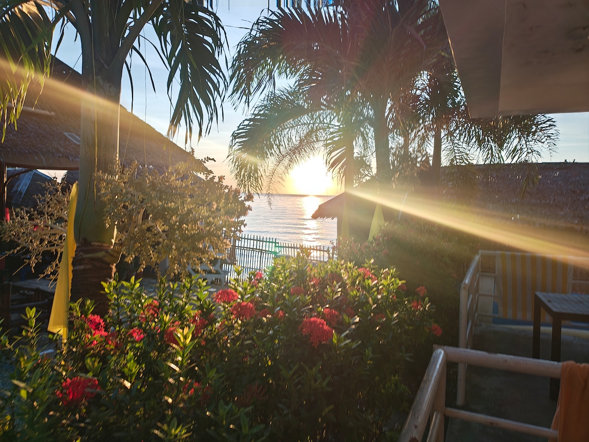 The beachfront cabin is located in Villa Eliza Ecofarm. Nestled in a coconut grove, you will have a sunrise view of the Panay mountain range, and a dramatic sunset view of Sulu Sea. The second floor bedroom has two semi-double beds, while the ground floor has a kitchenette and sink, a dining table, and bathroom with hot water shower. Perfect for small families and digital nomads who would want a quiet and private place by the sea. Has strong and fast signal for internet (smart and globe).