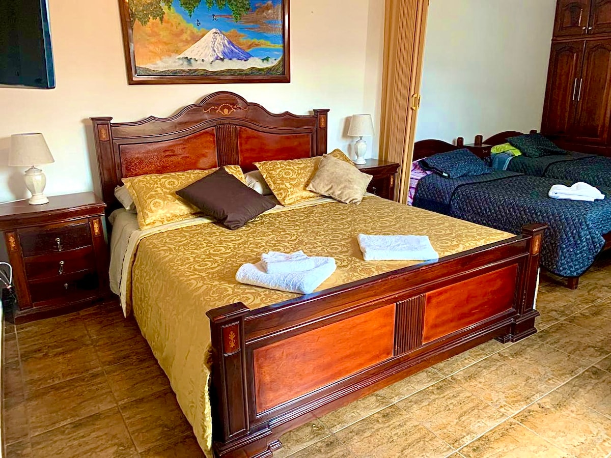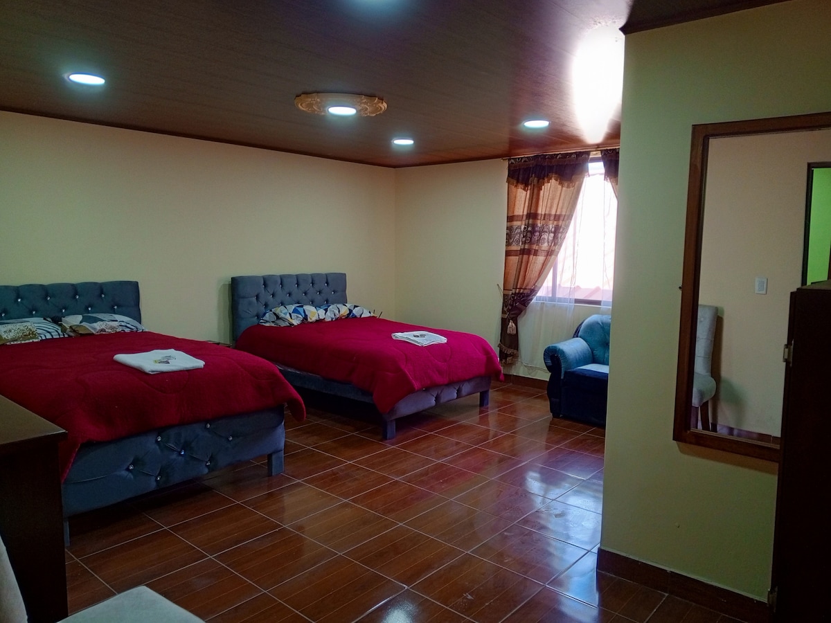 Te damos la bienvenida a tu exclusivo alojamiento ! Estamos ubicados frente al pulmón de la ciudad , a pocos metros del Río Tahuando y a 15 minutos del centro de Ibarra . Pueden hospedarse hasta 8 personas y disfrutar de hermosos jardines , aire puro y vistas privilegiadas , además una piscina temperada con paneles solares , turco,jacuzzi, área de parrillada, cocina , dos comedores , área de baile , fogata , vestidores , duchas , baños y gimnasio . Es el lugar que mereces disfrutar !