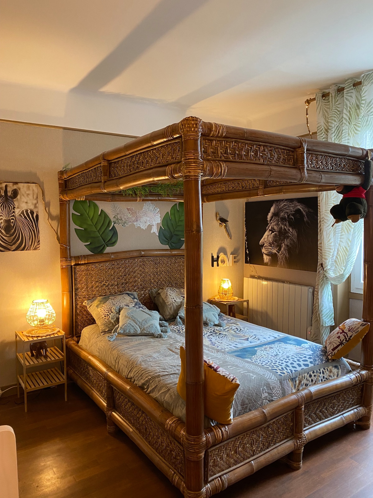 une chambre avec 1 lit (160x200) et 1 canapé lit (120x190) plus lit parapluie avec salle de bain wc indépendant et privé . avec une petite cuisine équipée micro-ondes frigo gasiniere vaisselle et ustensiles de cuisine petit-déjeuner et jacuzzi accessible avec supplément ( jacuzzi : 10 euros de l heure par personne, 5 euros pour les enfants de moins de 5 ans accompagnés de leurs parents petit déjeuner en supplément 12.50 euros par personne et 6 euros pour les enfants de moins de 5 ans.