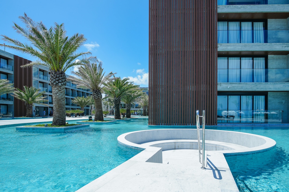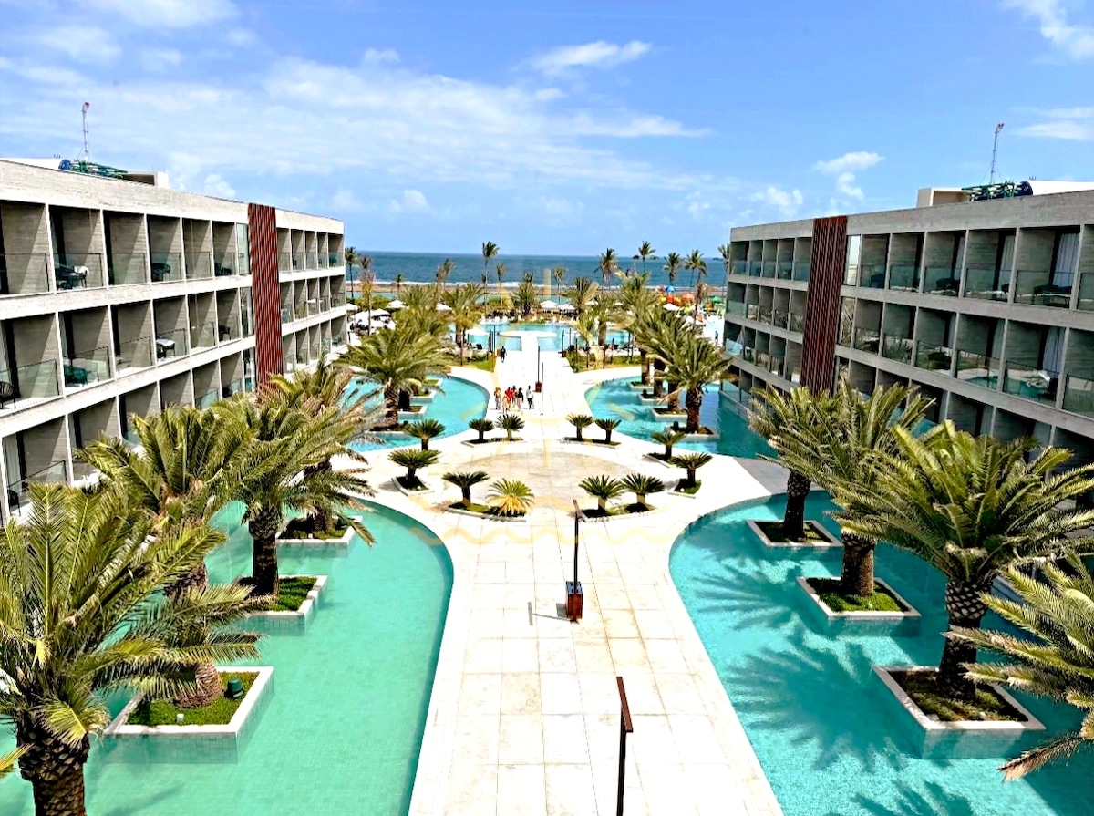 Curta uma experiência luxuosa ao ficar neste lugar especial.quarto com cama de casal e sala com sofá cama pra 2 pessoas,tv e ar condicionado em todos os cômodos,Resort novo e de altíssima qualidade,são várias piscinas para desfrute de sua família,pé na areia com piscinas naturais e passeios incríveis