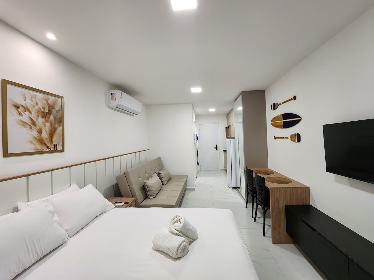 Localizado no coração de Porto de Galinhas, em frente as piscinas naturais, a poucos metros do centrinho , o Porto Mykonos, está situado a 30 metros da melhor e mais bela praia, rodeado pelos melhores restaurantes. O Studio possui vista para o mar, cozinha compacta, cama casal e bicama . São fornecidos jogos de cama e toalhas. Edifício novo, com rooftop de tirar o fôlego com vista para as piscinas naturais, prainha, piscina adulto, infantil, Ilha seca e churrasqueira.