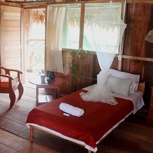 Habitación doble en lindo ecolodge a 10 min. del aeropuerto de Iquitos y 30 minutos el centro y plaza de armas .De estilo rústico y natural, poseen balcón con hamaca y servicios higiénicos privados. En el ecolodge vivirá experiencias con la cultura amazónica kukama, tendrá mucha paz y excelente vista panorámica de atardeceres dramáticos. . Electricidad 24 h, terraza con mecedoras, biblioteca, mesas para estudio y una escalera que te lleva a darte un chapuzón en el río. Incluye desayuno.
