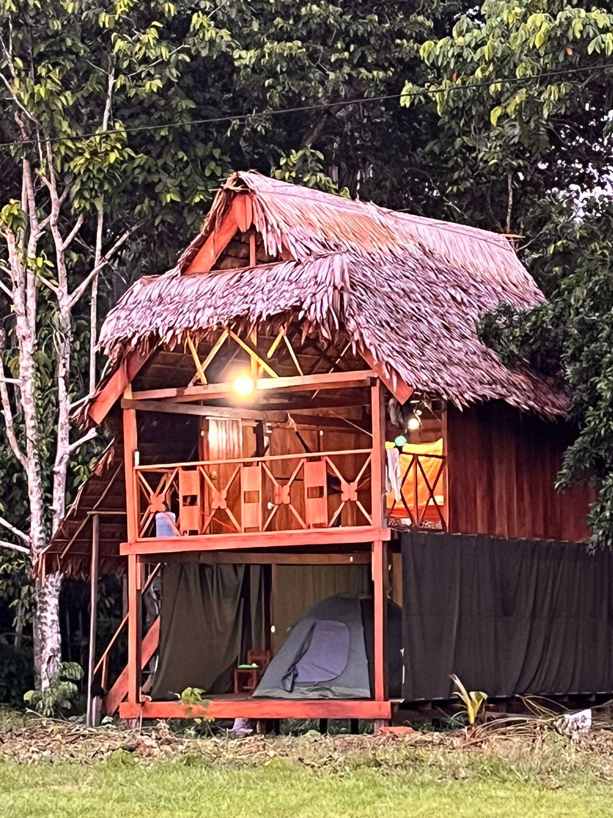 Maloka de dos pisos en la selva amazónica – Caserío Nueva Vida, Loreto Descansa y reconecta en una maloka artesanal ubicada en plena selva alta, a 50 km de Iquitos. Construida con techo tejido a mano con hojas de irapay, esta cabaña de dos pisos ofrece una experiencia auténtica, rodeada de naturaleza y tranquilidad. \ El espacio; La maloka mide 8 x 4 metros y cuenta con altillo y escalera externa. Tiene energía eléctrica y conexión a internet satelital de alta velocidad.