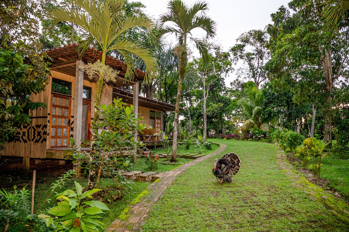 El Bullicio de la Cabaña, ubicada a orillas del Lago de Rumococha, combina sencillez y confort. Aunque en el día se escuchan ruidos de fábricas, el lago conserva su encanto y ofrece paisajes únicos. La cabaña cuenta con sala comedor amplia, alberca e internet WiFi. De noche reina la calma y durante el día puedes navegar, pescar o fotografiar la naturaleza. Un lugar auténtico para descansar y disfrutar de la Amazonía.