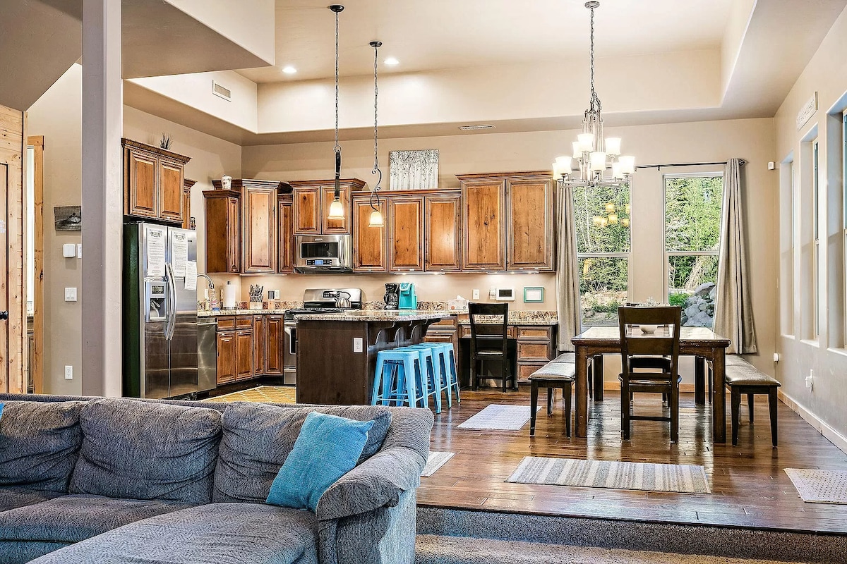 Private Hot Tub, Fire pit, Game room, Outdoor Fireplace, and more! Welcome to luxury in the mountains! This home offers 5 spacious Bedrooms, 4 Bathrooms with custom wood ceilings, Large covered deck with Private Hot Tub, fireplace, table, and sofa seating. Additional amenities include a Fire pit, large lot with parking for large trailers and multiple vehicles a game room with a large smart TV, pool table, shuffle board, sofa seating, dart board, large connect 4 game and more!