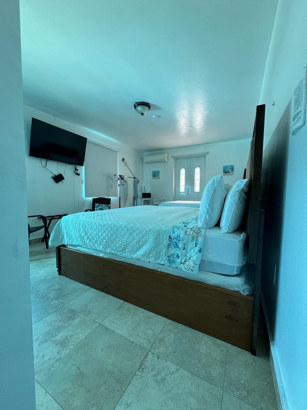 This is a studio on a cliff with a spectacular view facing mangroves, Middlesex and Poza El Teodoro beaches and the Atlantic Ocean. Each studio has Smart TV internet, private bathroom, kitchenette microwave, electric coffee maker, small refrigerator, queen size bed, side table, futon (convertible to twin size bed), AC and a balcony with ocean view. The common areas for the studios are a pool, gazebo, sitting area by the pool and they all have ocean view. Pets are not allowed.
