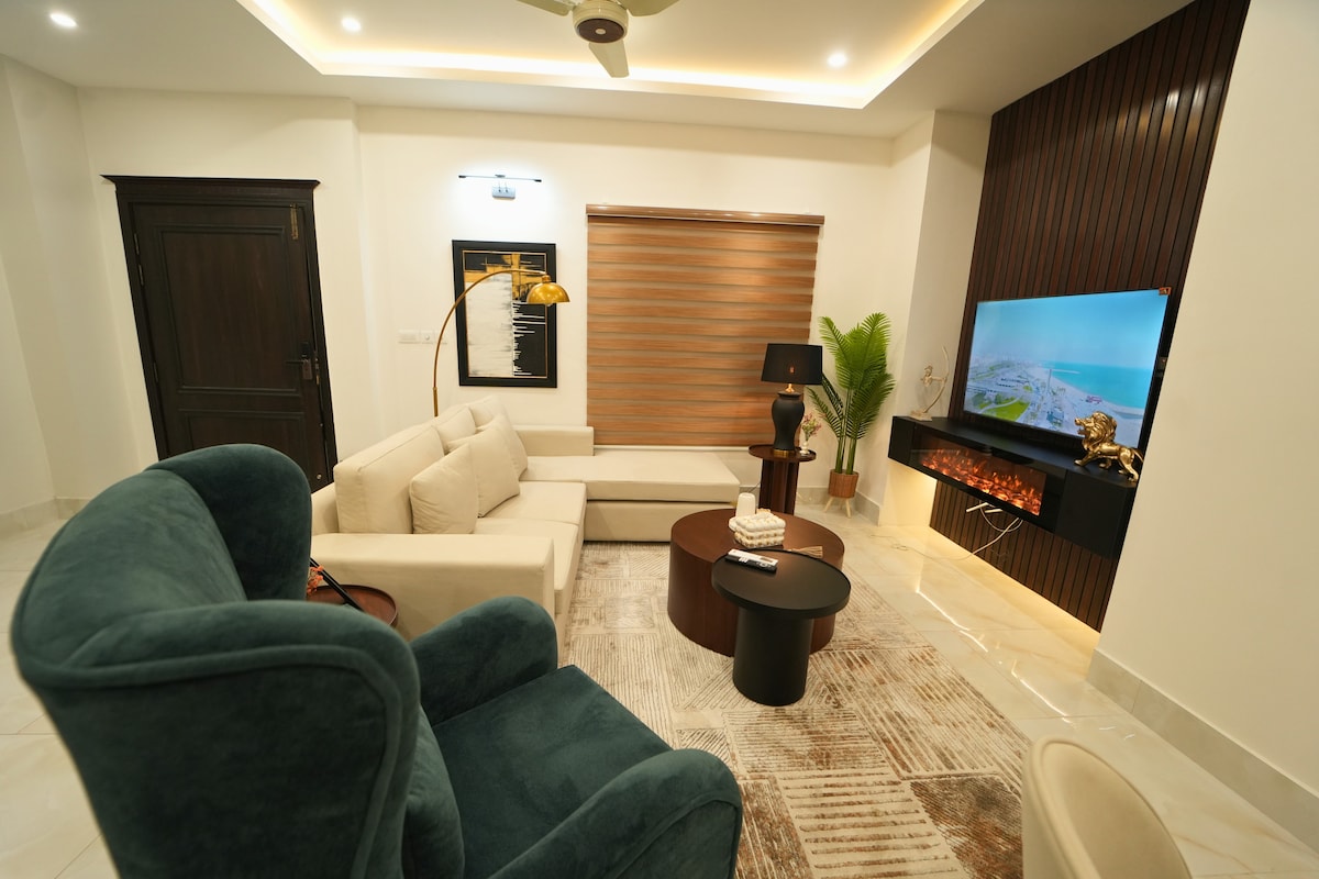 Experience luxury living in this stylish 2-bedroom apartment in Bahria Town Rawalpindi, featuring king-size beds, a 65” Smart TV with Netflix, high-speed Wi-Fi, air conditioning, and hot/cold water. Enjoy stunning Eiffel Tower monument views from 3 private balconies. Ideal for families and business travelers, with 24/7 security, a dedicated housekeeping team, and a peaceful, upscale neighborhood. Book now for comfort, convenience, and unmatched hospitality.