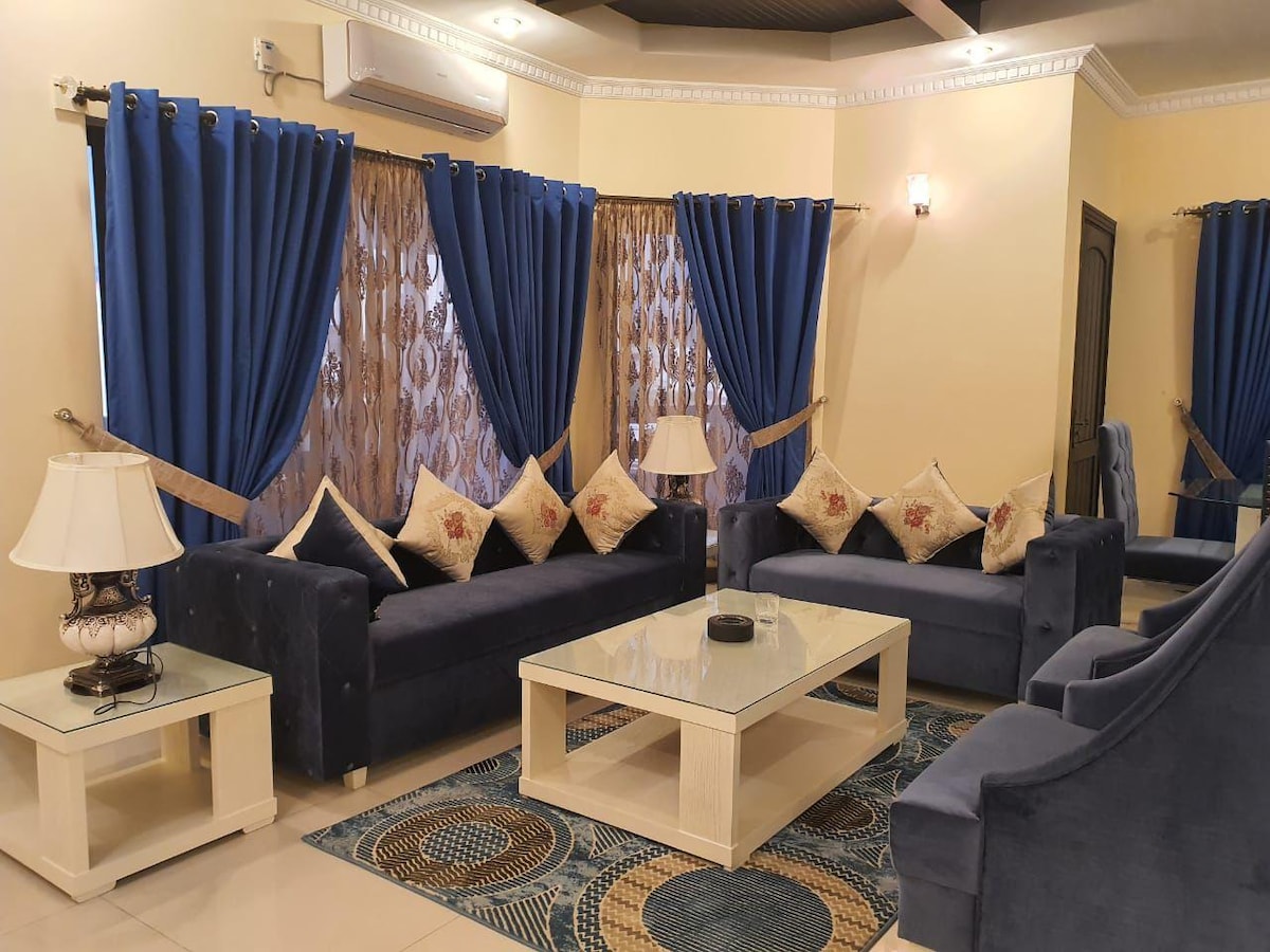 No other rental beats this lavish, Centrally located, secure & immersed in serenity beautifully designed & tastefully furnished independent 3 bedrooms residence with private entrance & parking for families, business travelers & anyone looking for a Royal luxury Home @ Central Location. Soak up the modern & vintage charm of this Royal brand new villa. Extraordinarily lavish designer furnishing, spacious rooms, greenery, spectacular views & workplace. Large beautiful garden to host gatherings.