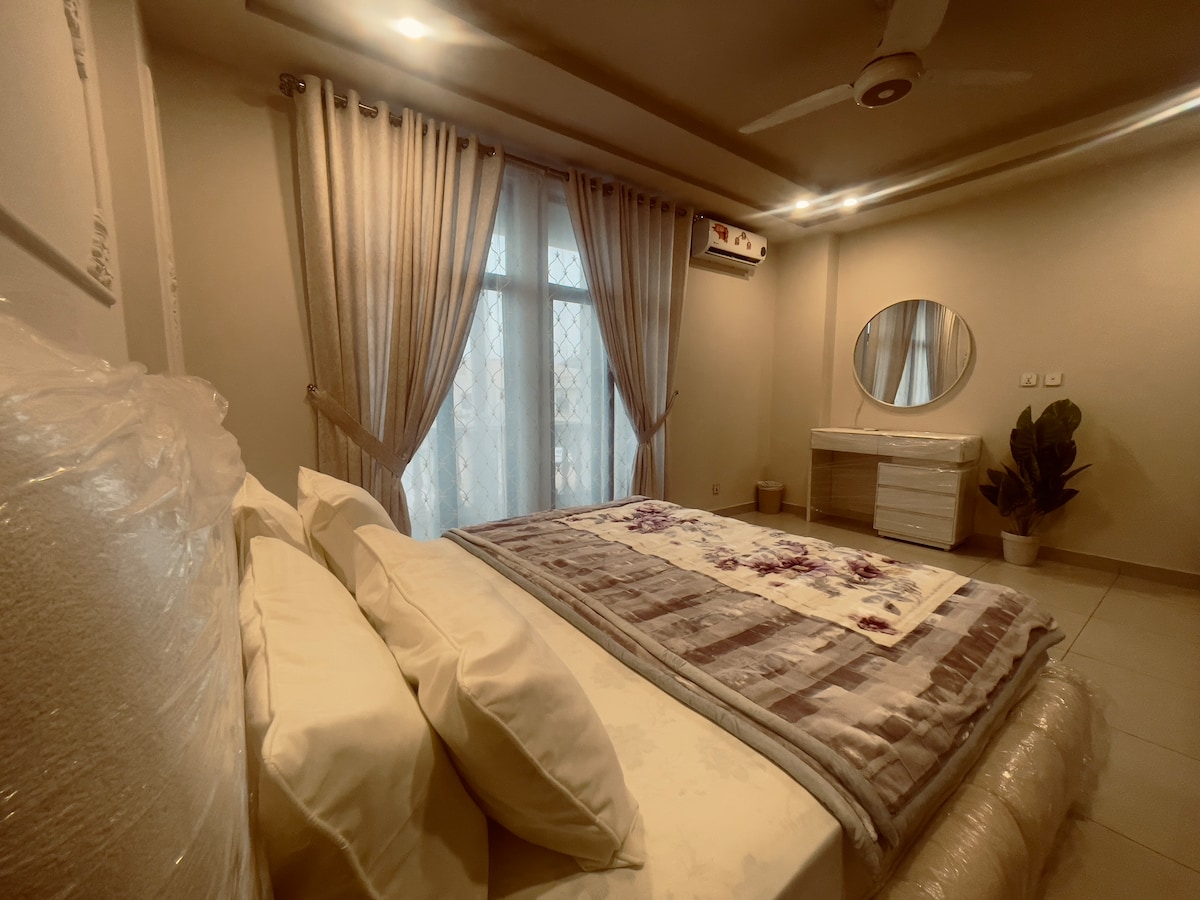 Welcome to your stylish 2-bedroom retreat in DHA Phase 2, Islamabad! This modern, fully furnished apartment features: 🛋️ A cozy lounge with smart TV, YouTube access & AC 📶 High-speed WiFi — perfect for work or streaming 🌇 Private balcony with seating & scenic views 🍳 Fully equipped kitchen + fridge 🛏️ 2 comfy bedrooms with clean linens & storage 🚗 Free parking + easy access to main road You're just minutes from Giga Mall, Zeta Mall, Bahria Town, and Central Park. Its all in one spot