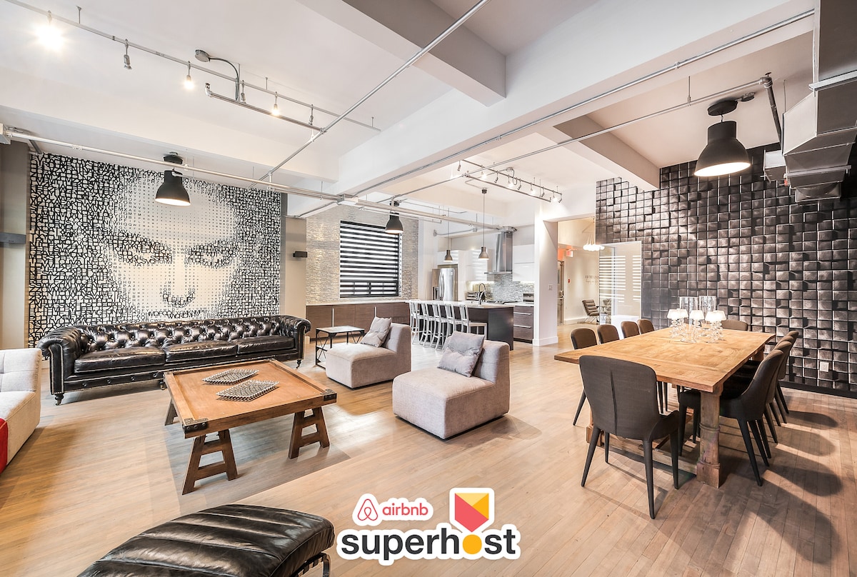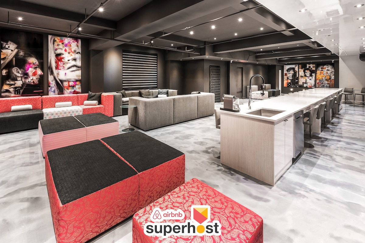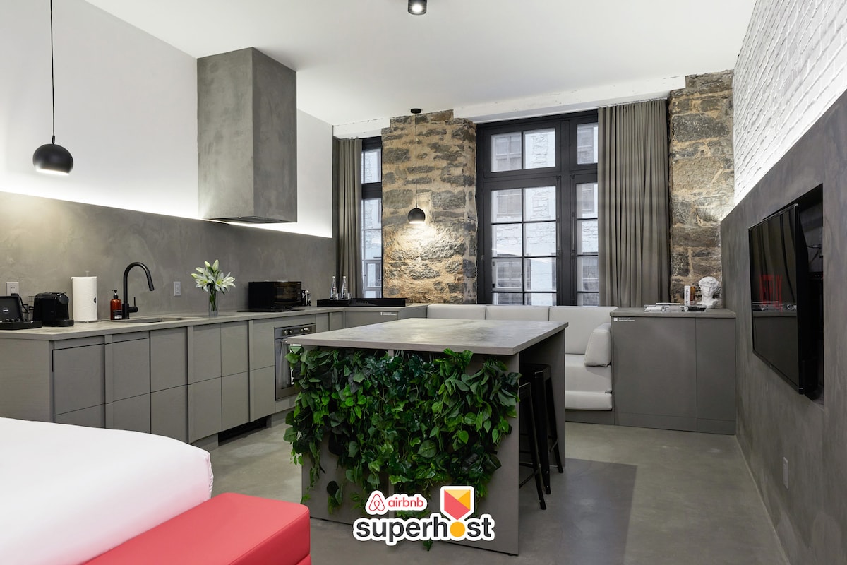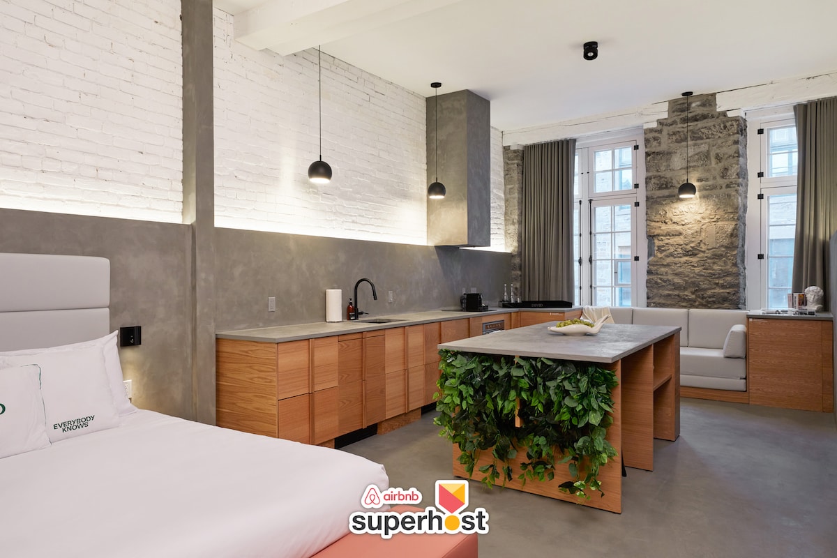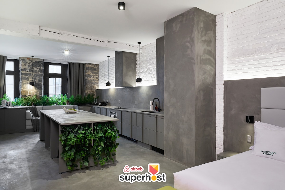 A vibrant and versatile 3,500 sqft loft in the heart of Downtown Montreal. Four bedrooms with private bathrooms and Smart TVs 🍳 Fully equipped kitchen with island, stove, oven, fridge, and Nespresso machine 🛋️ Living room with Smart TV (cable), SONOS speakers, and customizable lights 🚗 Parking recommendations on your Boarding Pass 🧳 Nearby luggage storage options ⏰ Early check-in or late check-out upon request Prime location surrounded by the city’s best restaurants, shops, and attractions