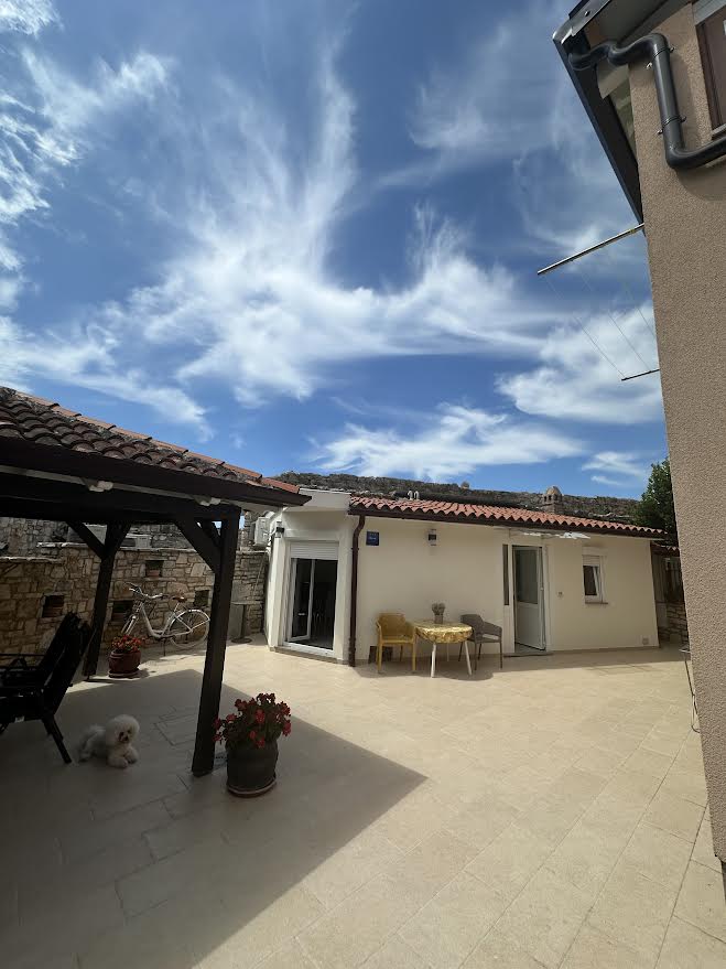 The Guesthouse is part of the Villa Elizej property. It’s a separate accommodation in the same courtyard, about 25 meters from the main house where the owners live, offering guests privacy and comfort. Designed as a cozy retreat for two, the studio is perfect for couples to relax and enjoy their stay. Outside, a peaceful garden with olive trees and deckchairs invites you to enjoy the authentic atmosphere — with a glass of wine or a good book. The property is pet-friendly and ideal for cyclists