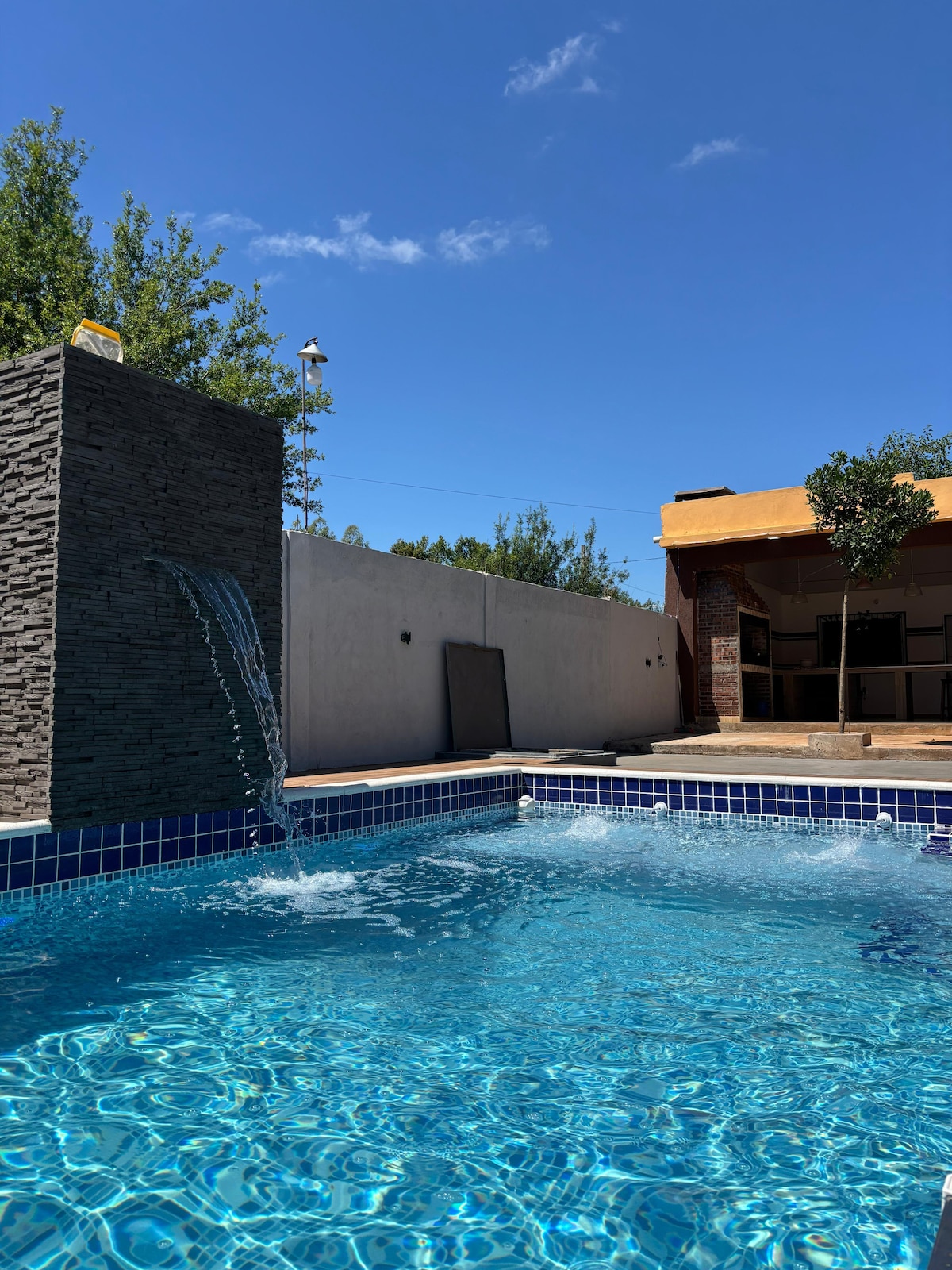 Casa muy completa en Coronel Bogado. Gran piscina 8.50 x 3 mts. con área para sentarse, reposeras, sillas con mesitas y sombrilla con mesa. Quincho amplio con parrilla hermética y visicooler. Barra del quincho. Mesa y sillas para 16 pers. Baño en el quincho. Cocina amplia con todos los accesorios, porta bidón de agua 20L y barra de desayuno. Comedor y Sala con Smart TV de 55”. Cuenta con 4 dormitorios, 2 en suite, todas las habitaciones con sábanas y toallas.