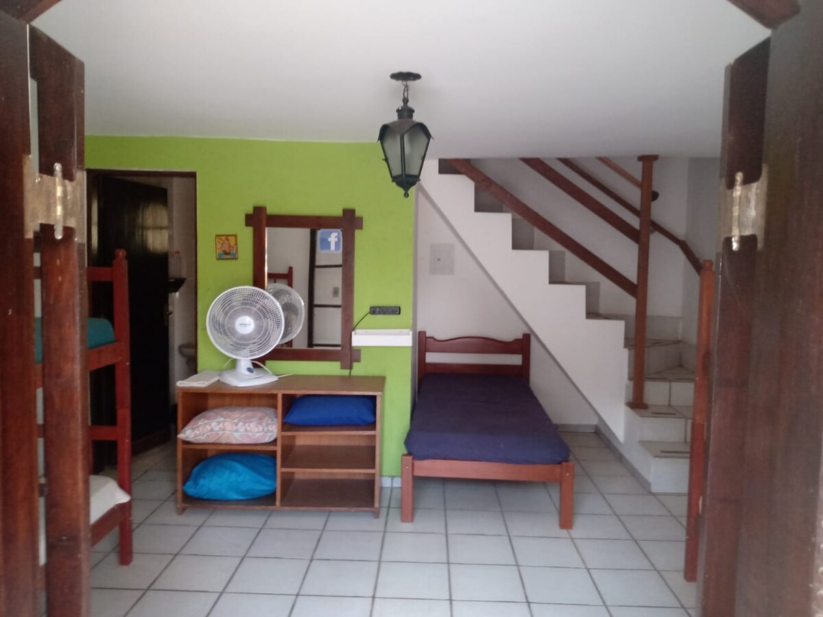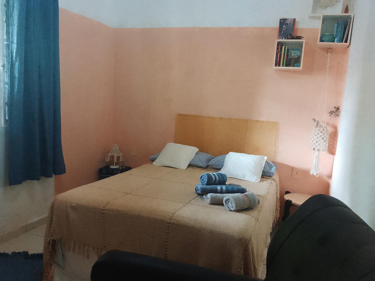 Mini casa completa para uma pessoa. Não permitimos visitas. Não aceitamos reserva feita para outra pessoa e/ou revezamento. Cama baú solteiro c/ colchão de mola e 2 travesseiros. Tv smart 24 pol Wi-fi 500 mg Ventilador de teto Geladeira, fogão, microondas e demais eletrodomésticos Cafeteira básica Utensílios de cozinha Roupas de cama e banho Chuveiro eletrônico Lavanderia e área de lazer compartilhadas Ambiente familiar e tranquilo Não temos estacionamento Atenção às demais informações