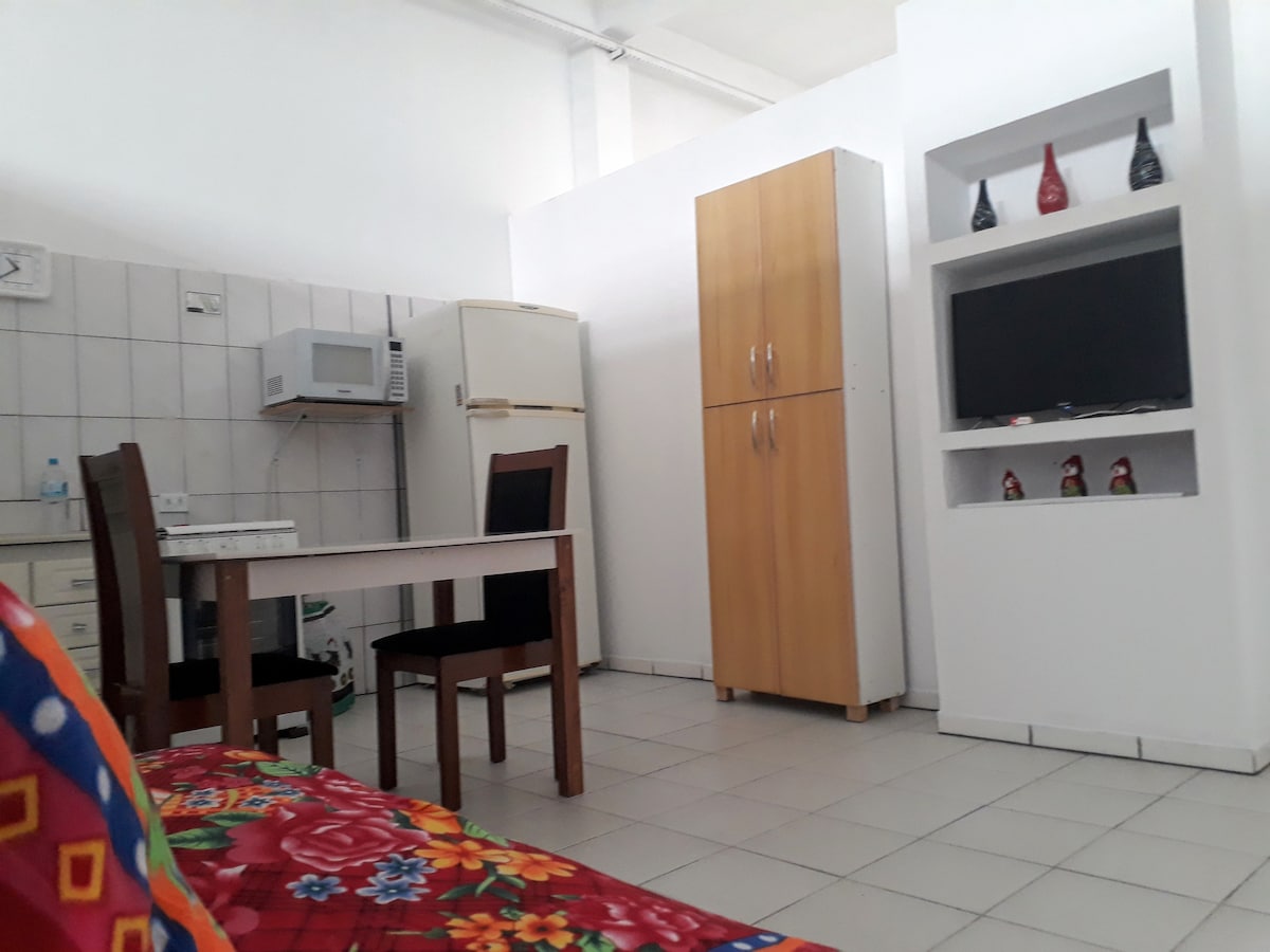 meu espaço é um flat, com 1 cama de casal e 2 solteiro, espaço com sofa e tv, cozinha geladeira fogão micro-ondas mesa e utensílios! e 1 banheiro !!