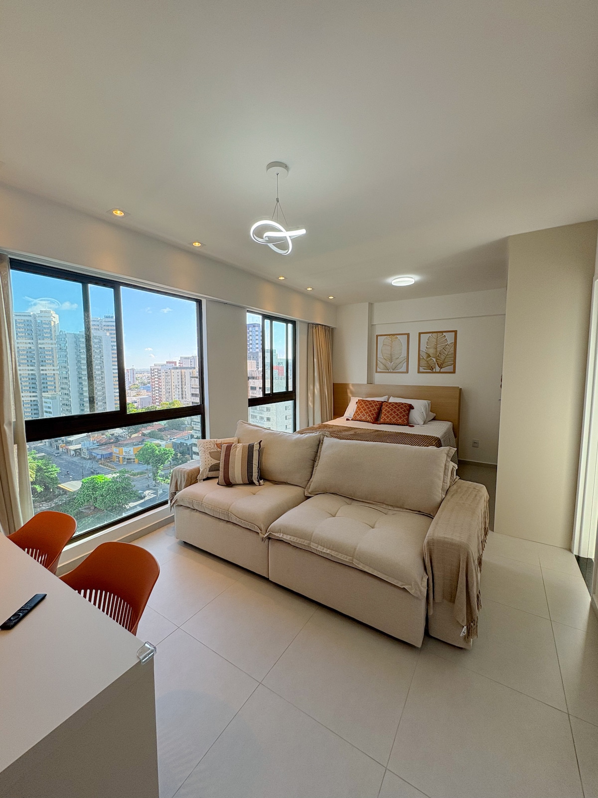 Flat completamente mobiliado, equipado e climatizado para fazer com que a sua estadia se torne uma experiência inesquecível. Localizado no empreendimento vencedor do prêmio melhor Home Service ADEMI2019 na praia de Barra de Jangada (do ladinho da Praia do Paiva) e com uma das melhores vistas para a Ilha do Amor que você poderá encontrar. Somos a união perfeita entre lazer e trabalho. O hóspede poderá usufruir de academia, sauna, piscina, lavanderia, recepção. A portaria funciona 24 horas.