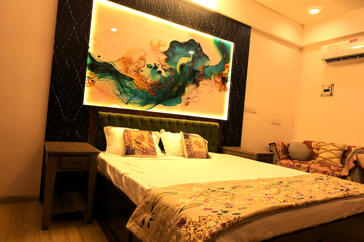 Welcome to this most luxurious and spacious studio apartment (completely separated) with balcony, comfortable king sized bed, beautiful bathroom and fully equipped kitchen, free wifi, free parking Swimming pool (open from April to September or October depending on weather) gym, rooftop garden. located in central of Jaipur, railway station is just - 4 mins away, bus stand - 4-5 mins away AirPort - 9 km Hawa mahal - 4 km City palace - 4.1