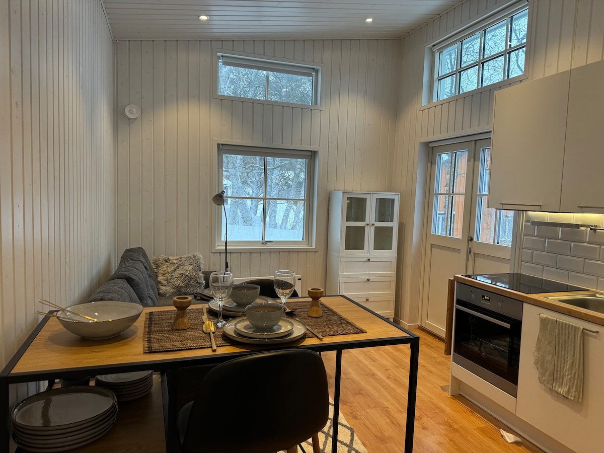 House (25 sqm). Private entrance, toilet, shower cabin & washing machine. The price includes bed linen, towels & final cleaning. One large room with a bed (140 cm), sofa (which can be used as a bed), desk. NO KITCHEN but there is a small refrigerator, micro & water boiler. As a hotel room - larger. Good storage and drying facilities. WIFI, TV with apple TV. Own part of patio. Not shoveled in winter. Parking space - by house. "Trixy" driveway up, due to road conditions.