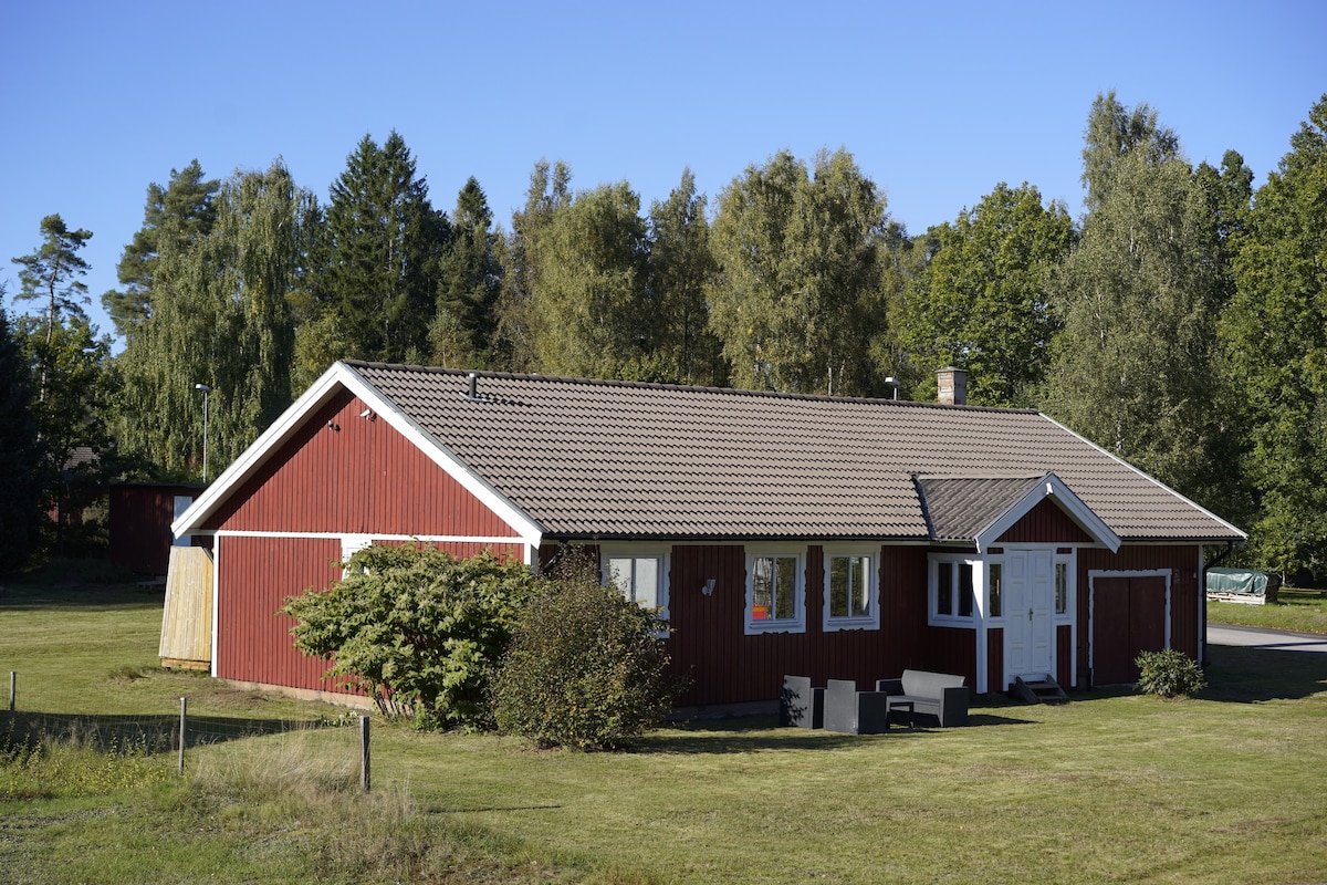 Mysig stuga med 3 sovrum, alla med nybäddade dubbelsängar. På bottenvåningen finns kök, uppehållsrum och ett badrum, bakom huset ligger mysiga grävda dammar.. På gården finns många söta djur, som man gärna får klappa. Gratis parkering. I Gårdsbutiken kan man köpa närodlat mat. Vi bor i stora vita huset, där ni checker in, när ni ankommer. Beställ gärna frukost innan ankomst. Sek 120,-/ person. Serveras i samma hus 7-9.00. Det finns ett hus till på fastigheten som också hyrs ut skilda uteplatser