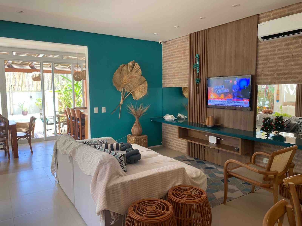 Casa térrea com três suítes em Condomínio novo. Arquitetura diferenciada. Ambiente muito charmoso. Todos os móveis e eletrodomésticos novos e bem equipada. Ar condicionado Daikin quente e frio em todos as suítes e frio na sala. Sky com pacote HBO. Churrasqueira. Condomínio com serviço de praia. Amplo deck com 50m2. Wifi. Ideal para até 6 adultos e duas crianças. Berço disponível sob consulta. Ambiente familiar. Acesso a praia pelo portão 6. Portaria 24H. Salão de jogos. Três vagas na garagem.