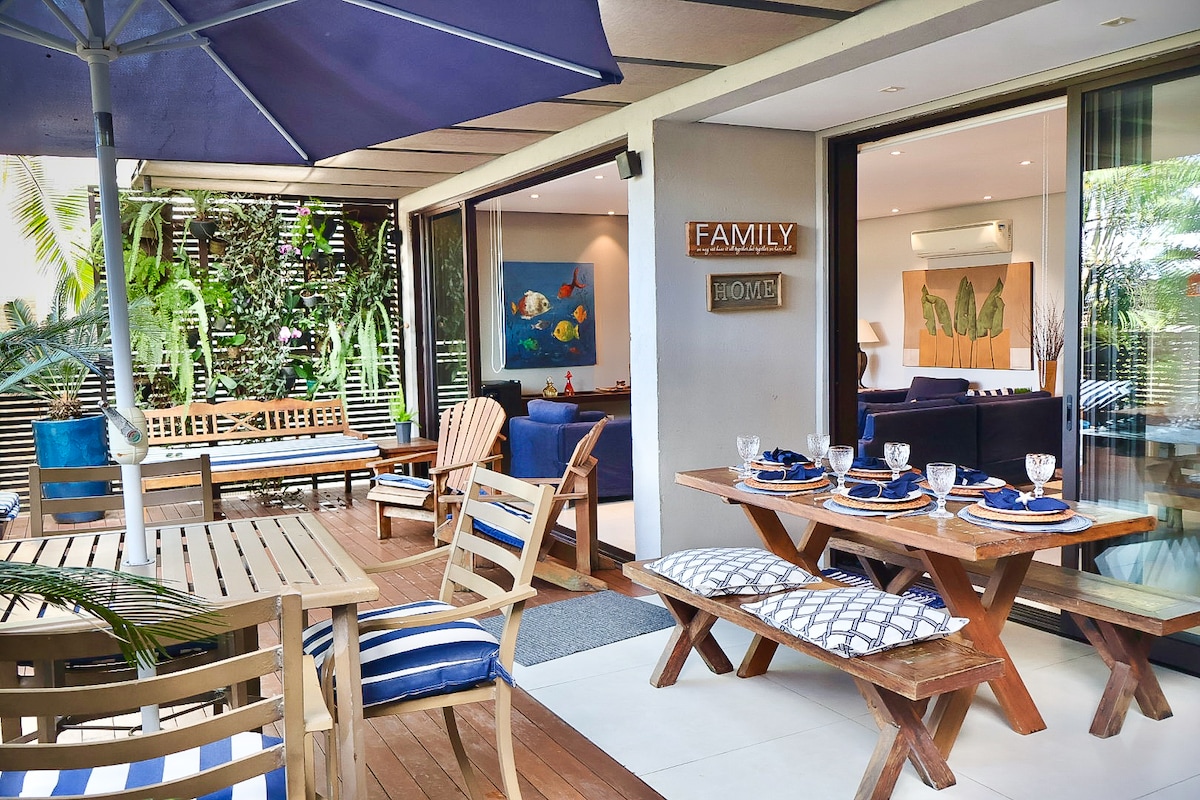 Cozy and modern beach-house, 220 m2, in condo with 24 hs security service. Perfect location: 150 mts away from the beach and 500 mts to the town center. No car needed! The condo offers free beach service and has a heated swimming pool.. 4 ensuite rooms (each with own bathroom), two private terraces with beautiful views, open kitchen, amazing deck with outdoor grill surrounded by native vegetation. All rooms have air conditioning, including living and dining room. High speed internet available.