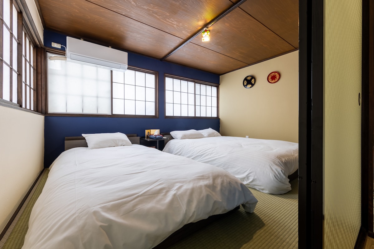 Stay in a cosy and quiet house with free use of 5 bicycles during your stay. The house is located just 8 minutes walk from Higashi chaya district. A maximum of 9 people can stay. <Floor plan> [1F] ・Living space (sofa bed x 1, spare mattress x 1) ・Cafe counter table ・Kitchen ・Toilet ・Bathroom ・Laundry [2F] ・Guest room A (double bed x 1, spare mattress x 1) ・Guest room B (double bed x 1, single bed x 1) ・Guest room C (single bed x 1) ・Free space (stair landing)