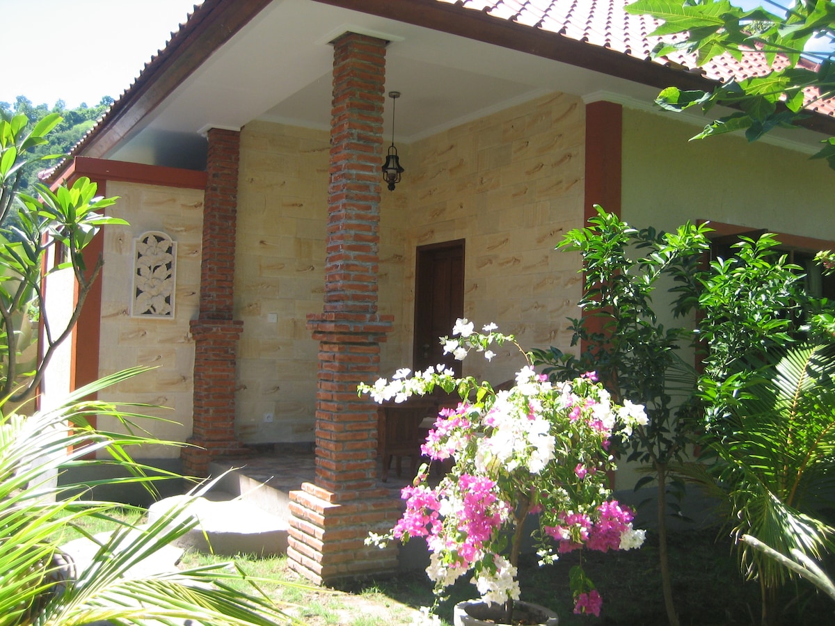 Our Bungalow is located in a quiet and luxury garden, with plenty of tropical flower. You will share a swimming pool, with a great view on the mountains, Agung in one side, other mountains on the other side. A nice place to relax your minds. Our bungalow is located on the Ground floor (3 steps to access to the room). Large bed in your room (160*200).