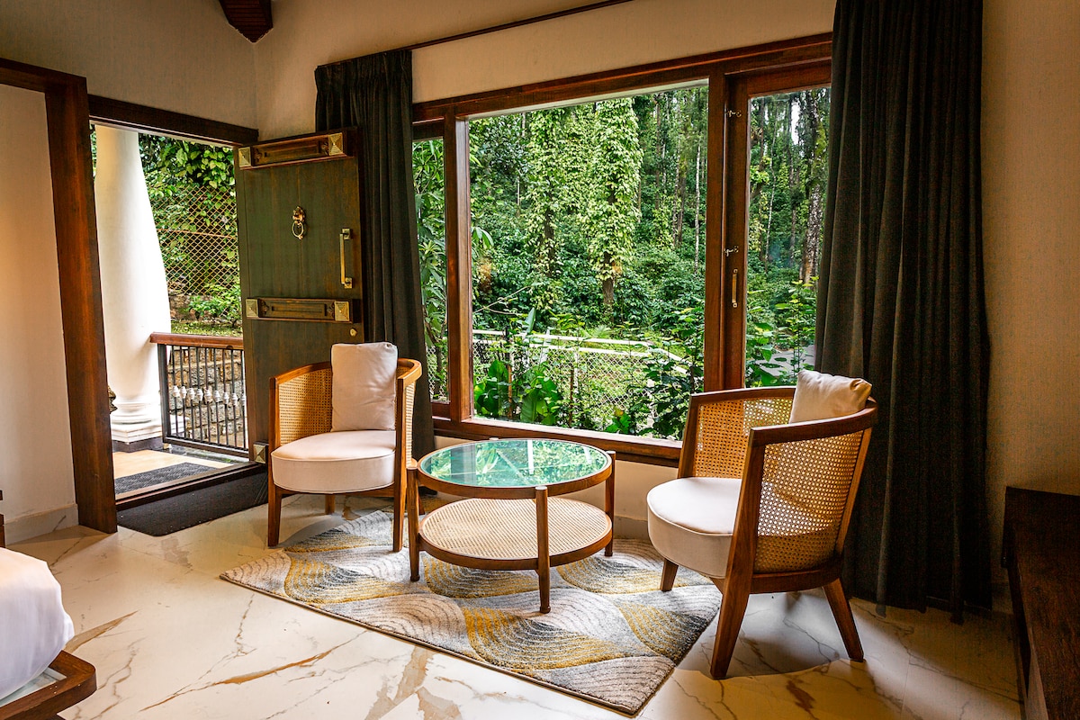 An independent cottage on stilts with wall to wall windows that offer great views of nature around & a balcony to complement this. Perfect for birders, nature enthusiasts, pet parents & people who want to chill amidst thick forests. Please note: The access to this cottage is a stoned staircase of around 25 steps down. People with mobility issues or obesity will find it difficult to access.