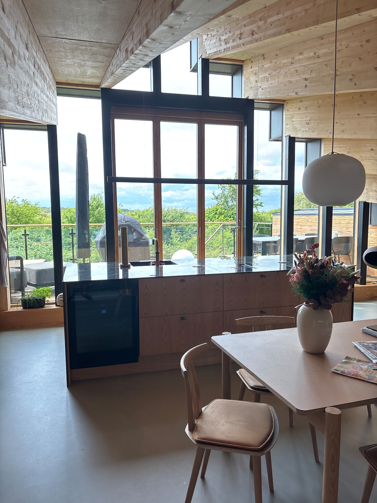 Smuk udsigt og eksklusiv kvalitet i 1. række med gåafstand til skov. Komfort og luksus med varme og gode materialer, bæredygtig indretning med mange loppefund og personlig hotel-stemning. Masser af plads i det store køkken-alrum, tunge og lydsikrede egetræsdøre til alle rum, 5 skønne Hästens senge (2 med elevation). Hems til børn, lækre badeværelser, stor udendørs jacuzzi med høj-effektive stråledyser. Jura kaffemaskinen leverer udsøgt kaffe. El-lader til bil og 2 SUP boards, grill, legetøj.