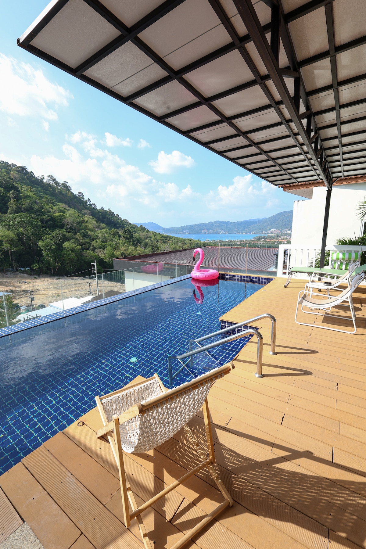 1.别墅 位置优越: 这是在芭东为数不多的独栋别墅。开车去芭东海滩、孟加拉酒吧街,卡伦等中心地带仅需5-10分钟车程,交通便利,晚上没有宵禁限制,适合探索芭东的繁华与活力。同时又远离喧嚣,当您领略了芭东的夜生活后,又可以独享私密安静的个人时光。 2. 全新装修,现代简约: 别墅于2024年建设并装修,有三间奢华简约的卧室,可容纳6位客人。每间卧室都配备了落地窗、室外阳台和干湿分离的卫生间,确保每位客人的隐私与舒适。 3. 空间设计: 一层:宽敞的室外休闲区和车库。周围环绕热带植物,适合放松身心,感受自然。 二层:温馨的卧室、设备齐全的厨房,以及玻璃屋客厅 。从客厅可以直接步入泳池。客厅四周落地玻璃环绕,可欣赏部分芭东海湾的壮丽景色和热带雨林风光。 三层:两间独立卧室和卫生间,配备两个舒适大床和纯棉床品,确保客人拥有深度睡眠。 4. 私人泳池: 别墅配备私人泳池。 5· 宁静与繁华的完美结合: 这座独栋别墅是一个理想的度假胜地,结合了现代奢华与自然美景,为客人提供舒适的入住体验。 愿您在这里度过一个轻松愉快的假期!