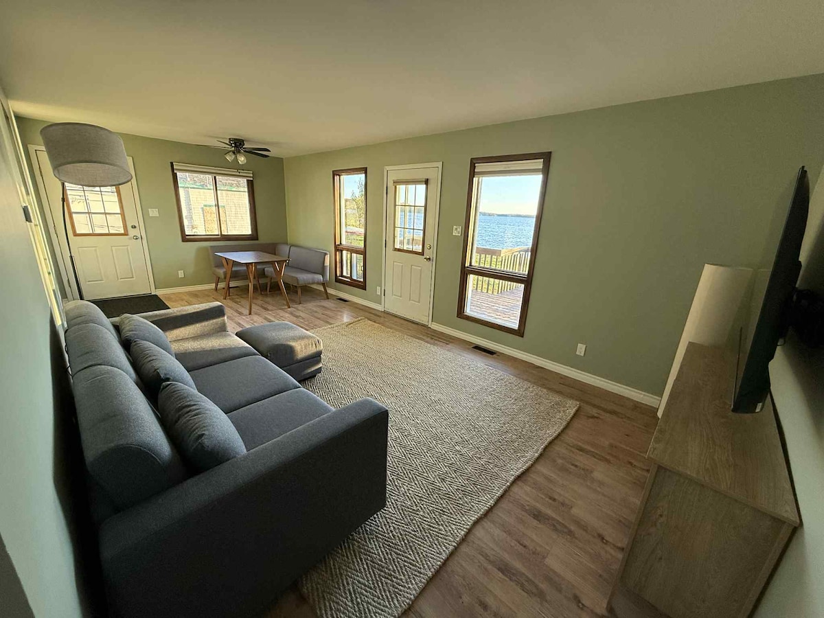 Great alternative to a hotel! Newly finished lakefront cottage. 650 sq ft. Has full kitchen, bathroom, bedroom (queen bed), living and dining-room areas with private deck overlooking the lake. Accommodates 2 very nicely. Private deck off cottage with table and BBQ. Dock and beach area sometimes shared with owner. Canoe and paddle boards for guest use