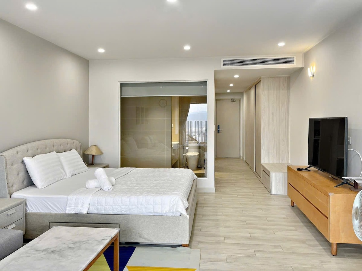 ✅️Studio apartment Nha Trang Center (Hoàn Cầu Building) 44m² ✅️Address: 20 Tran Phu, Loc Tho Ward, Nha Trang. ✅️The room is designed with 2 beds, one 1m bed and one 1.4m bed, comfortably accommodating 3 persons, a kitchen area fully equipped with cooking utensils... ✅️Large northeast-facing balcony, enjoy the sunrise over the sea from the balcony in the morning, and enjoy the shimmering lights from the pool at night. ✅️Standard accommodation for 3 adults, free for children under 12 years old.