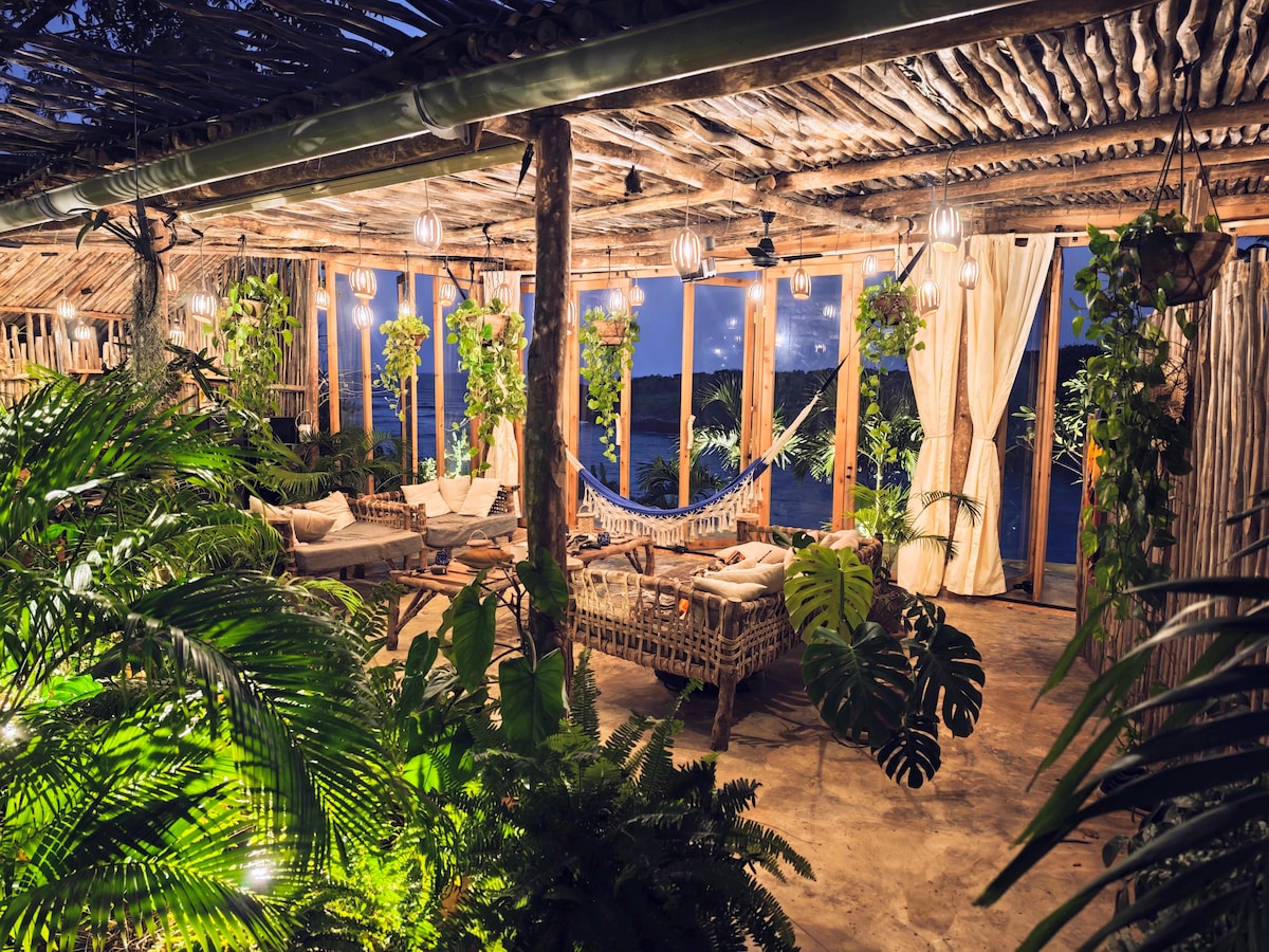 Jungle meets ocean at Figgito - sandwiched between tropical green and the endless blue. Two glass walls open fully to the sea; vines cascade from rafters inside as monstera climb the pillars, blurring the line between in and out. A kilometre of pristine beach waits below at low tide, reached through a private tunnel. Shower by two among palms and watch bush babies feed at dusk. Shaky chic - raw, wonky, entirely functional. A place to truly luxuriate.