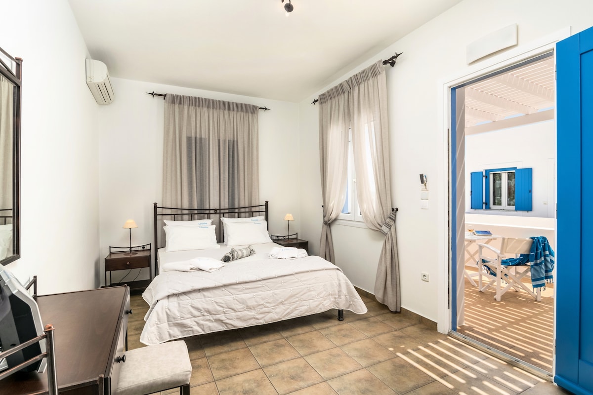 Aphrodite Studio is part of a traditional Cycladic house with an elevated view of the seaport of Adamas, built by Cretan refugees in 1860. It has since undergone significant improvements, with all modern conveniences such as electricity, running water, a modern-day toilet, and a kitchen. It still maintains its Cycladic character, with high ceilings and a sturdy, wooden roof. It is ideal for 2 people.
